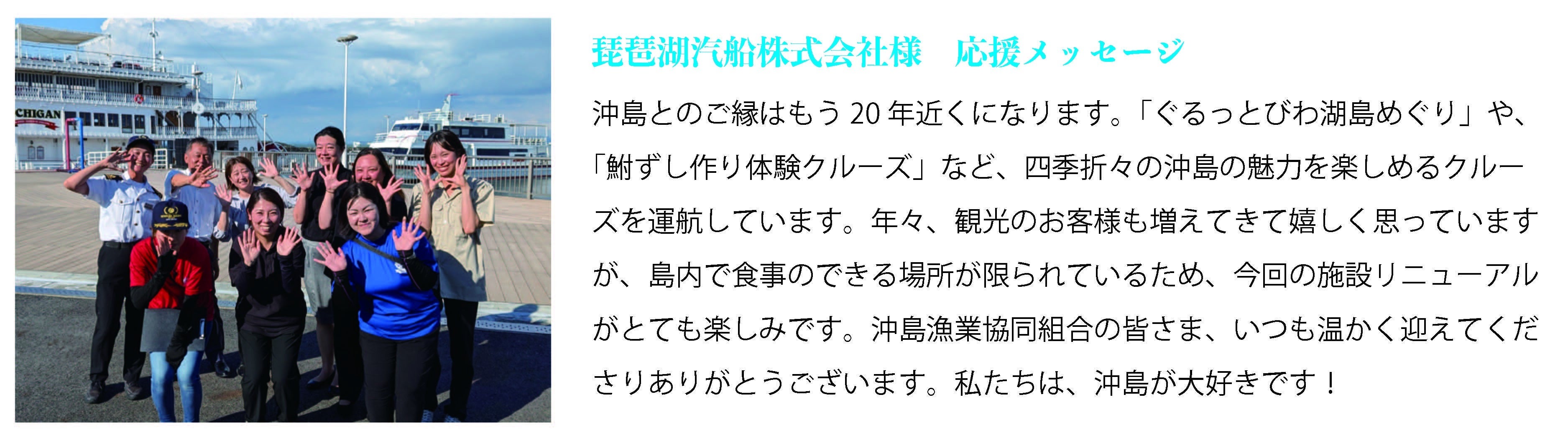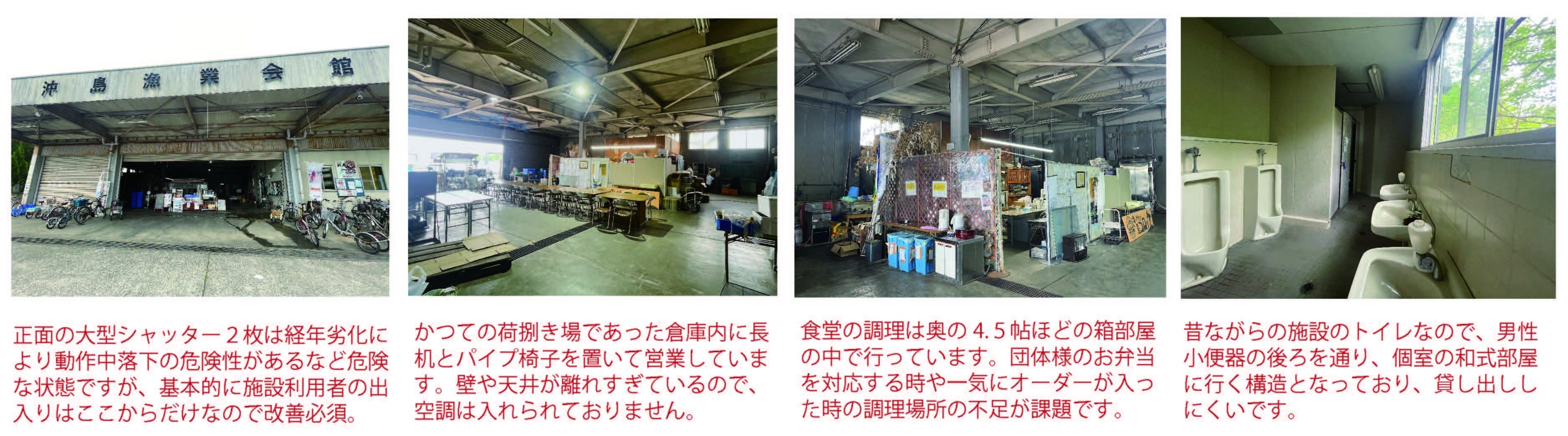 当施設の建設当初(昭和55年)は沖島に観光業や飲食店の需要がある未来を想定していなかったため、観光受け入れ施設としての機能は不足しております。後付けで設置したための厨房の設備不足や、空調のない半屋外の客席での営業は夏は汗だく、冬は風が吹き込む寒い中でお客様にご利用いただだいております。もちろん従業員も環境や動線が整わない中の営業への苦労が多いです。お客様の増加は嬉しいことなので、これからも期待に応え事業を発展させ、湖魚を食べる機会を多くの人に提供していくためには食堂部分を快適にする再整備が特に重要だと考えています。
