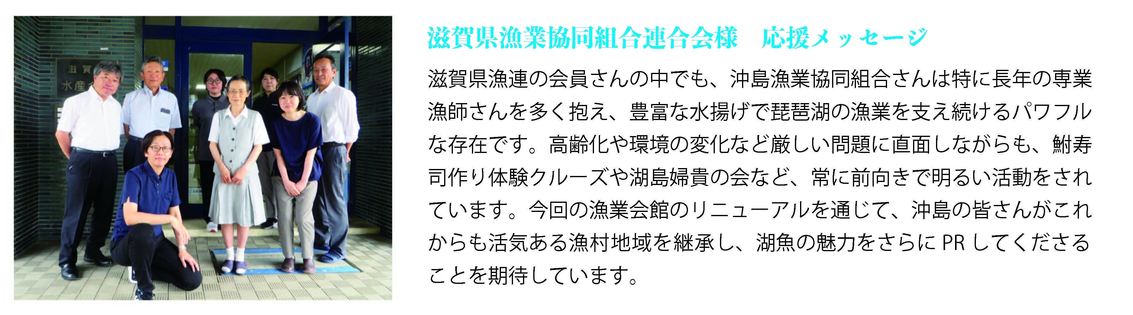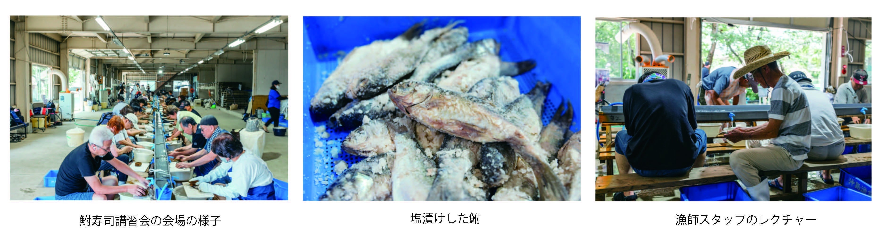郷土料理である鮒寿司の食文化継承に力を入れており、毎年夏に地元の船会社と共同実施している鮒ずし作り体験クルーズというツアーでは雄大なびわ湖の船旅を楽しみながら沖島を訪れていただき、当組合の漁師スタッフのレクチャーを受けながら鮒寿司の漬け込み体験をし、湖魚のお弁当や島散策も楽めるという大人気の企画があります。発酵食品のブームや、匂いが少ない製法になったことにより鮒寿司の美味しさと伝統の魅力に気付く方が増え、幅広い世代の方が参加されています。