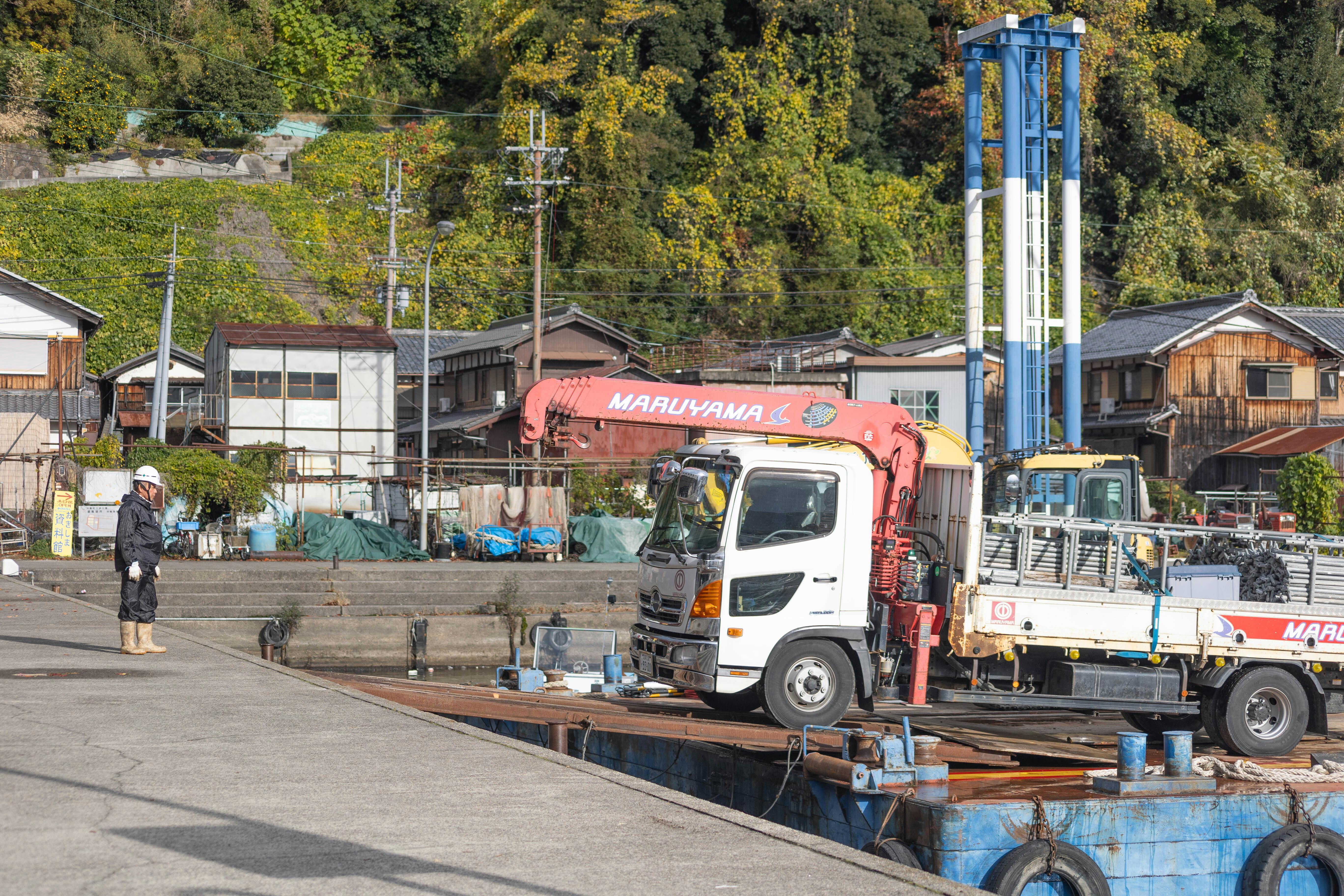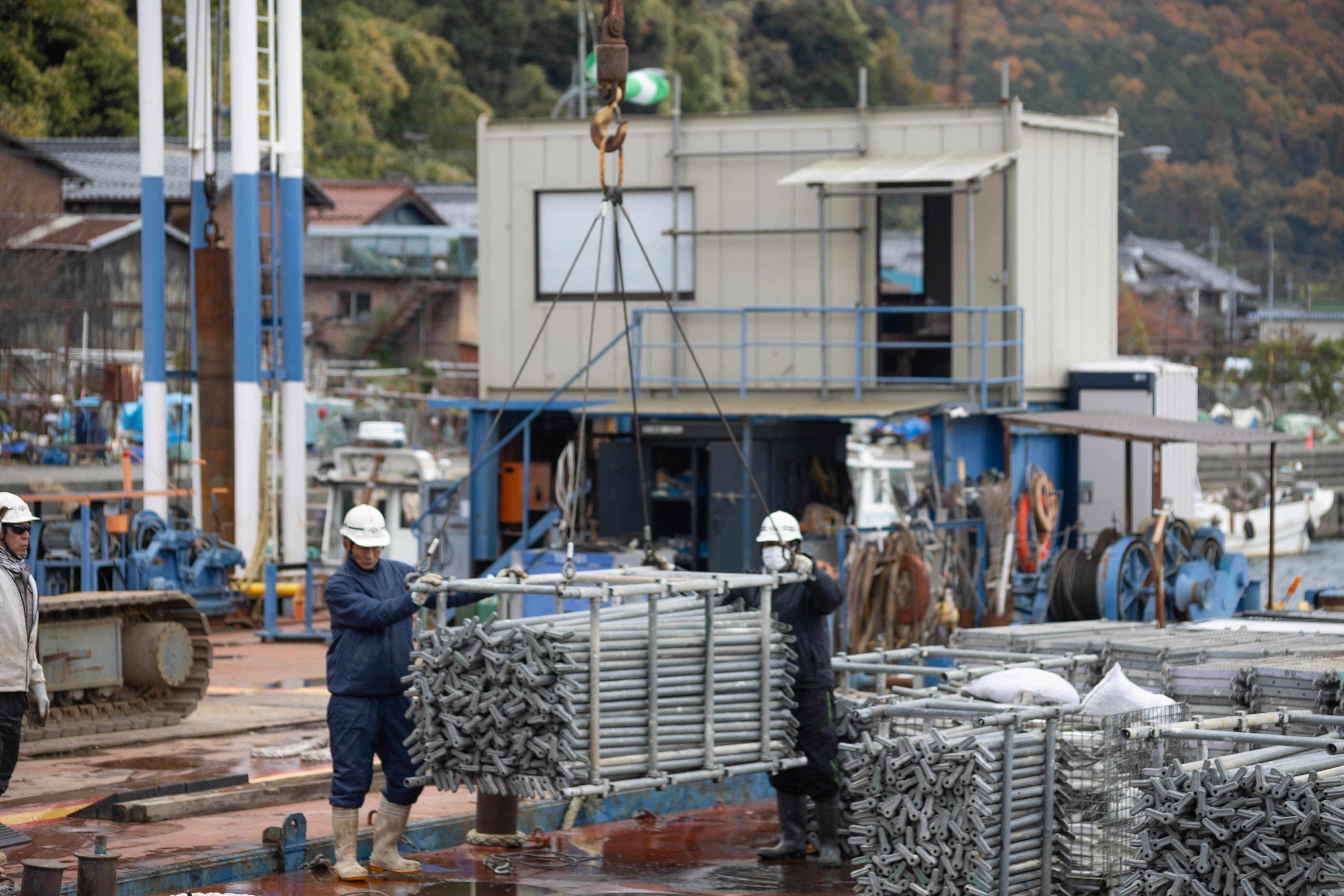 資材運搬船の着く位置は船舶も移動してもらい作業しやすく。