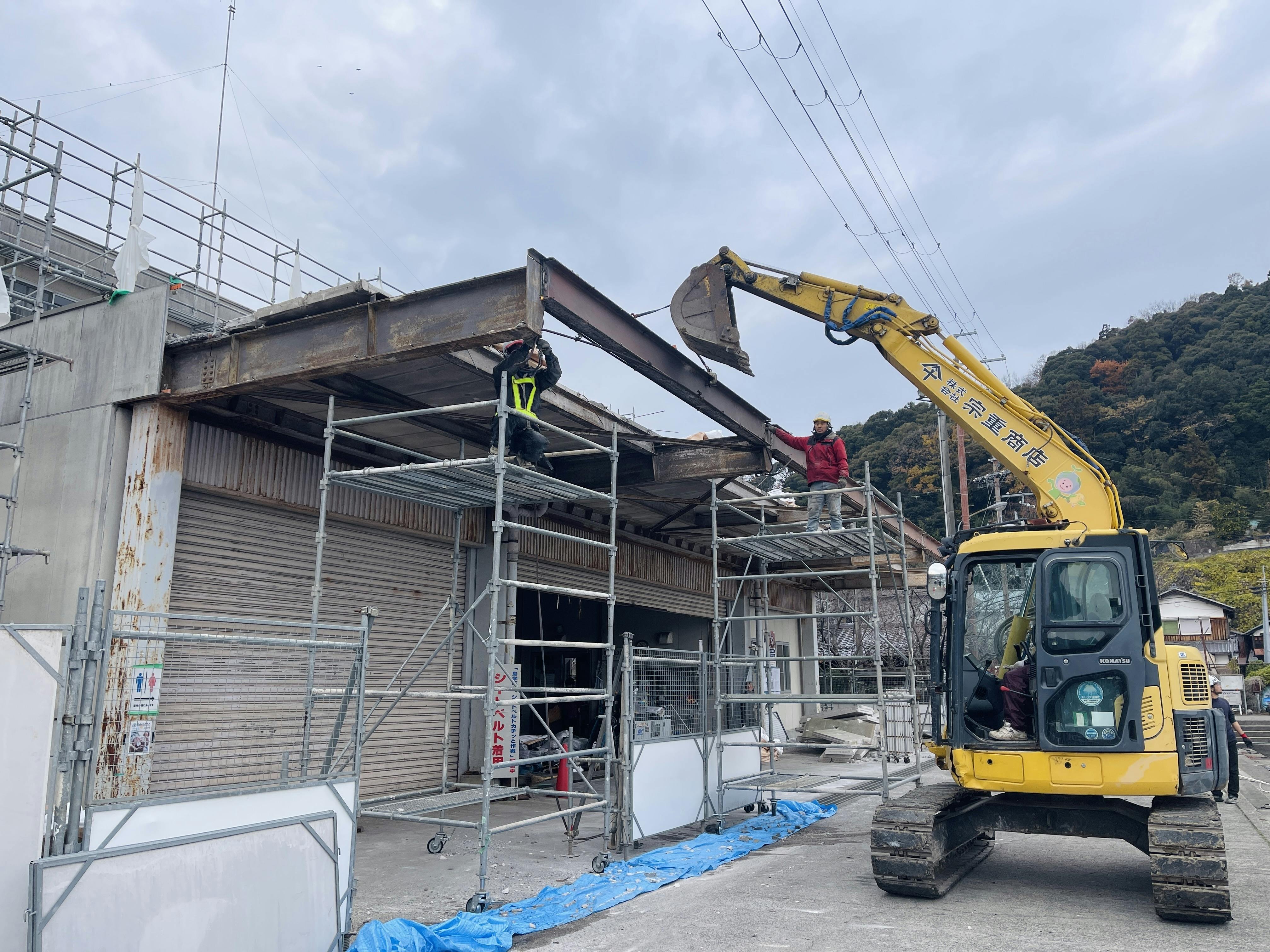 ユンボで庇の一部撤去