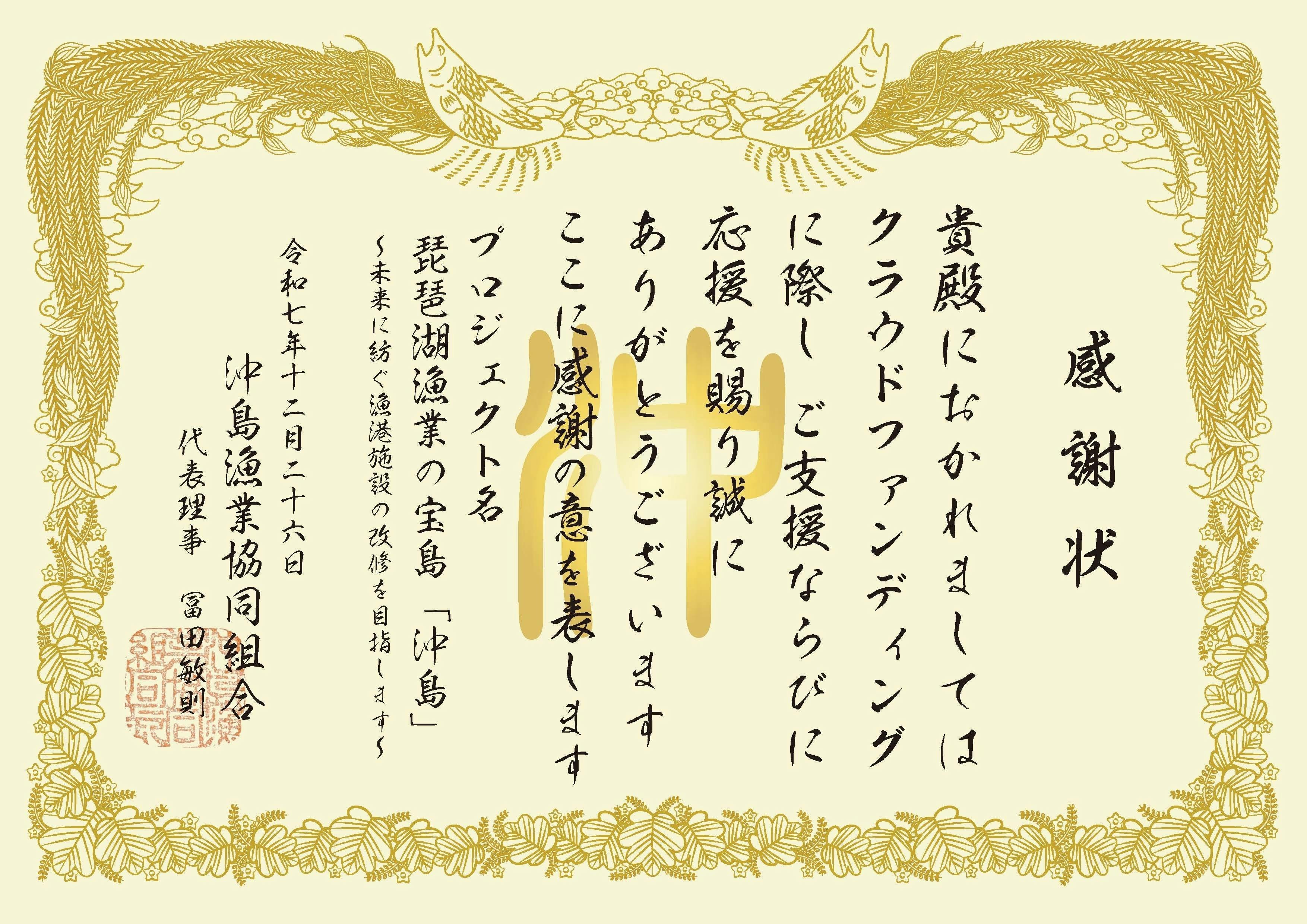 2025/12/26 14:16年末のご挨拶と感謝状画像の配布について2025年も残り一週間をきりました!ここ毎年のことですが琵琶湖の水位低下のニュースが目立ちます。雪が多いと大変なこともありますが山には冬らしく雪が降り積もってまたその雪解け水が琵琶湖に流れいい影響を与えてくれることを願います。さて、今回は年末のご挨拶と感謝状画像の配布のための投稿となります。皆様下記よりダウンロードお願いします!▼タップ感謝状画像ファイルダウンロード画像はSNS投稿などご自由にお使いください。注:現地または郵送にて感謝状贈呈と書かれたコースでご支援いただいる方には改めて記名したものを印刷して来年夏秋の竣工時のタイミングでお渡しさせていただきます。ちょっと一部モチーフを漁業っぽくアレンジしてますので気づいていただけたら…2025年はこのようなプロジェクトを立ち上げさせていただきご協力ならびに応援してくださる皆様と繋がることができ本当に支えられた一年でした。箱を作るだけでなく、その後その中でどんな人たちが関わり合い事業を育て守っていくのか、考えないといけない課題は山ほどありますが皆様の応援を糧に来年も頑張っていきます。グッズ等のリターンは一月以降から順次ご準備させていただきますのでしばらくお待ちください。工事の進捗状況来年より、内外部の改修箇所の解体工事等入ってきますので下準備として電気器具照明等の撤去、耐震工事に関わる箇所の解体、仮設工事等進んでいます。ユンボで庇の一部撤去ぐるり足場立ちました。一般立ち入りはできません港ど正面の工事なのでご迷惑おかけします。事務所引っ越ししました、寂しげ。移動先の事務所はフォークリフトの格納倉庫なのですが電気屋さん建具屋さんのおかげで想像以上の快適さ。2階の多目的室、床シートもベロベロであまりいい状態ではなかったですがここで集会や忘年会、一回だけですが婚活イベントが開催されたのはいい思い出。懲りずに綺麗になったらぜひ再び、笑食堂も引っ越ししました。現在は冬季休業中なので販売等行なっておりません。移動先で営業する準備を整え中なので、テイクアウト等していただける予定です。なんとか引っ越しできましたが長年溜めに溜めた物で溢れ返ってました。倉庫には実は沖島の石材業や漁業での貴重な資料も眠っていたり…研究者の先生や学生さんにご協力いただき保管・整理等も行なっています。昔の水産関係の冊子なども面白いので何か閲覧できる形なんかもできたらと。まだもう少し色々片付いてませんがまた来年‥皆様、どうぞ良いお年をお迎えください。来年もどうぞ沖島漁業協同組合を宜しくお願いします。 もっと見る