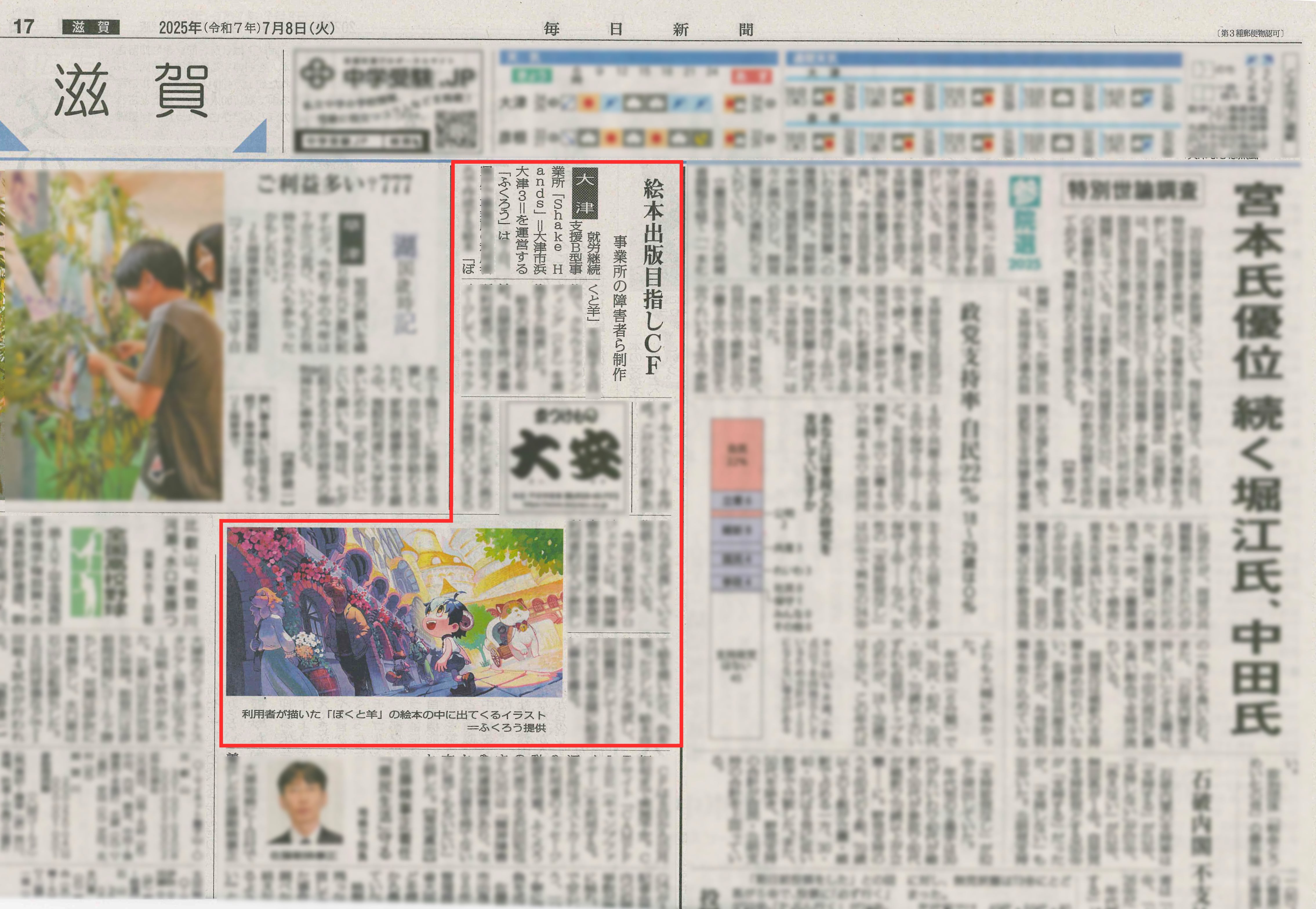 2025/07/11 17:00絵本『ぼくと羊』のクラウドファンディング始動が、7月8日(火)付の毎日新聞・滋賀版に掲載されました!このプロジェクトは、ShakeHandsが就労支援B型の現場から取り組むオリジナル絵本制作企画で、発達障がい・精神障がい・HSPなど“見えづらい生きづらさ”を抱えるメンバーたちが創作に参加しています。記事では、クラウドファンディングを通じて絵本出版を目指す背景や、表現活動が社会とのつながりになる過程が紹介され、メンバーによる描き下ろしイラストも掲載されています。クラウドファンディングはすでにスタートしています!ぜひ応援・拡散いただけるとうれしいです!!! もっと見る
