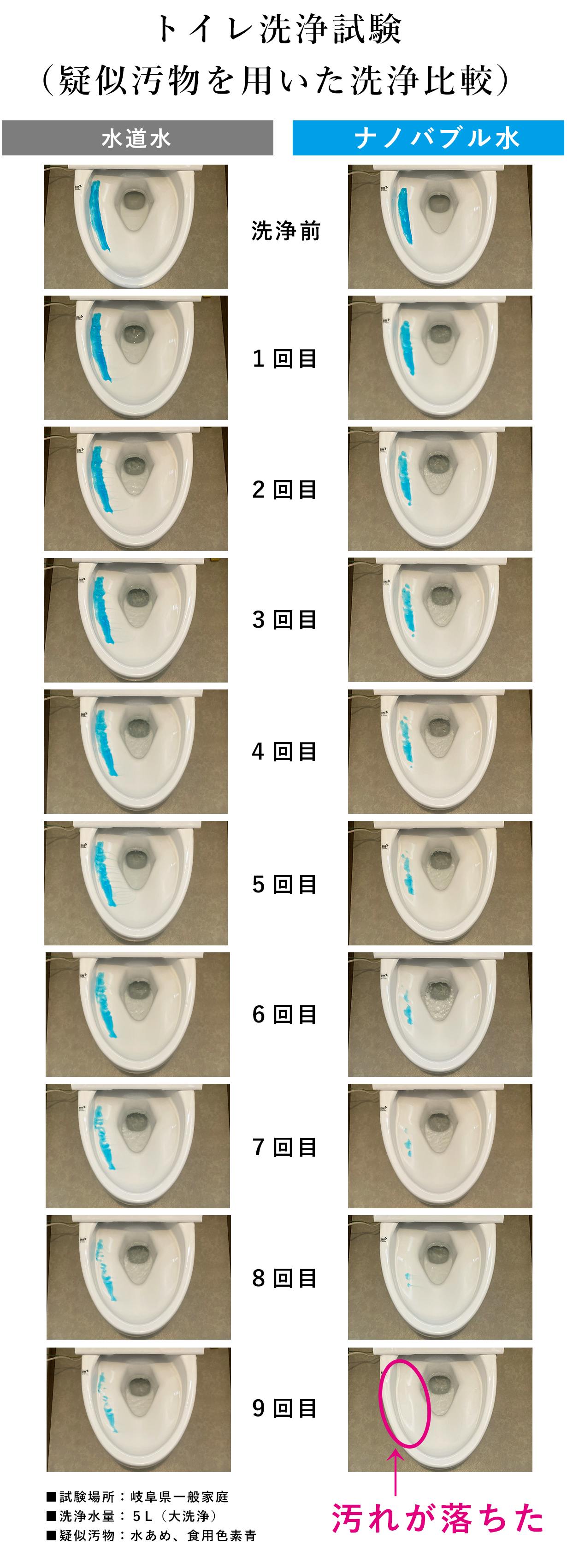 ナノバブル発生装置を装着する「前」と「後」で、どのような違いがあるのかを検証した結果です。※下記試験は、岐阜市の一般家庭の蛇口を"全開"にした状態です。