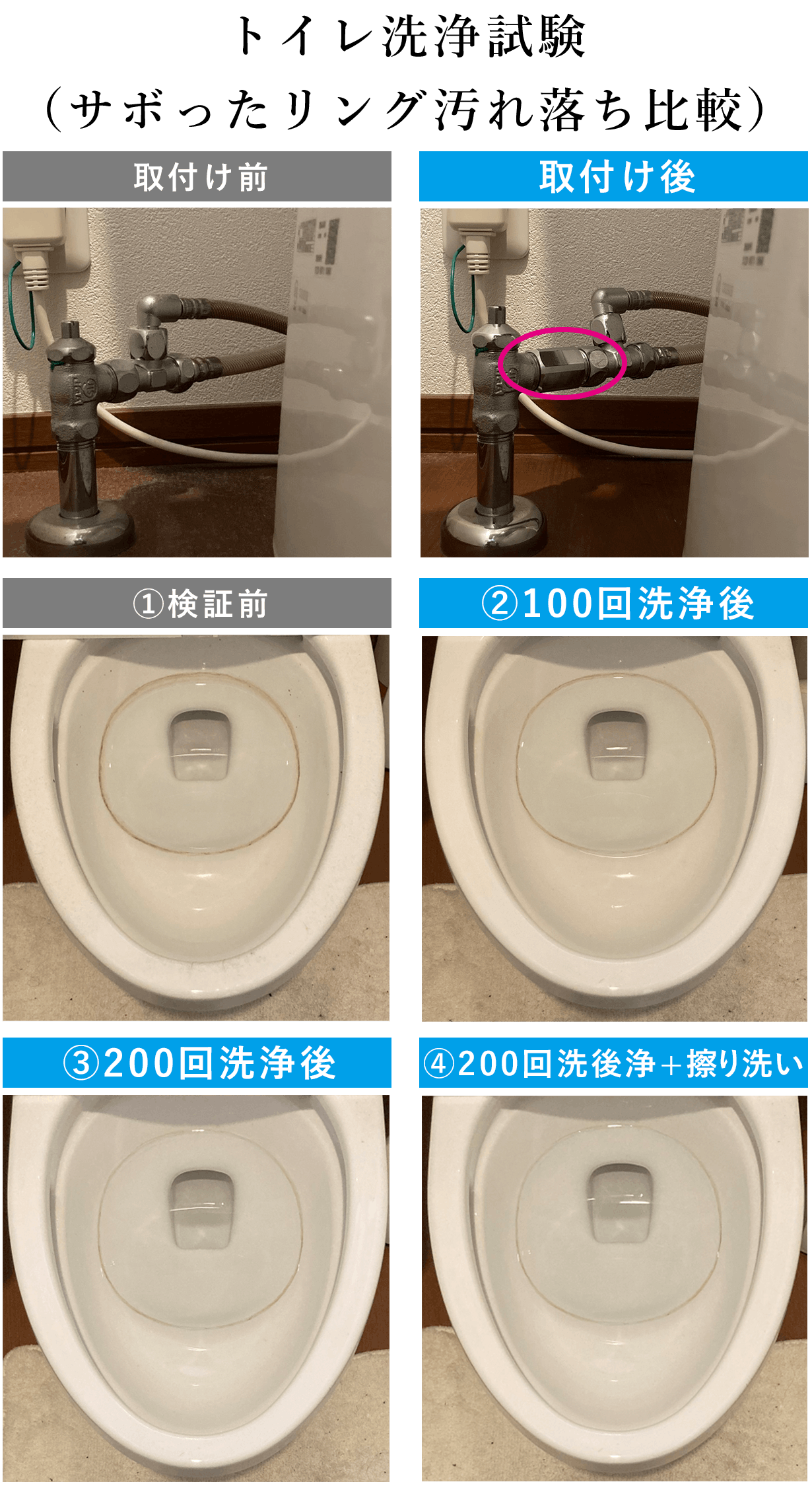 10ヶ月間掃除をしていない便器の黒ずみ・サボったリングの汚れ落ちを検証。本製品を止水栓に設置して、大洗浄で流した結果です。※自社試験(使用環境により、結果は異なる可能性がございます。)