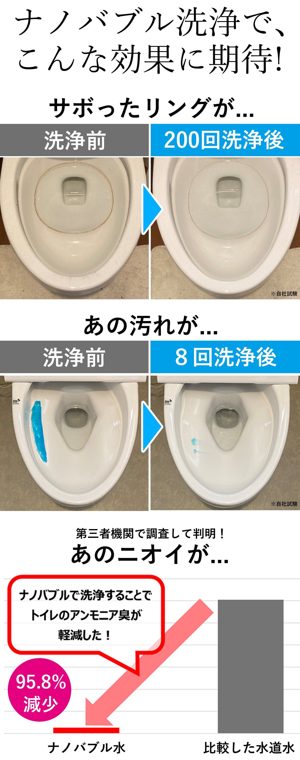 ナノバブルの研究を進めていると、「ナノバブル発生数が多いから良い」や、「ナノバブル発生粒径がこうだから良い」など一概には言えないことが分かってきます。そのため現在は、目的・用途に応じた研究開発を行っております。今回は「トイレ用(住宅設備機器用)」として、"汚れ落ち対策"と、"ニオイ愛作"にフォーカスいたしました。