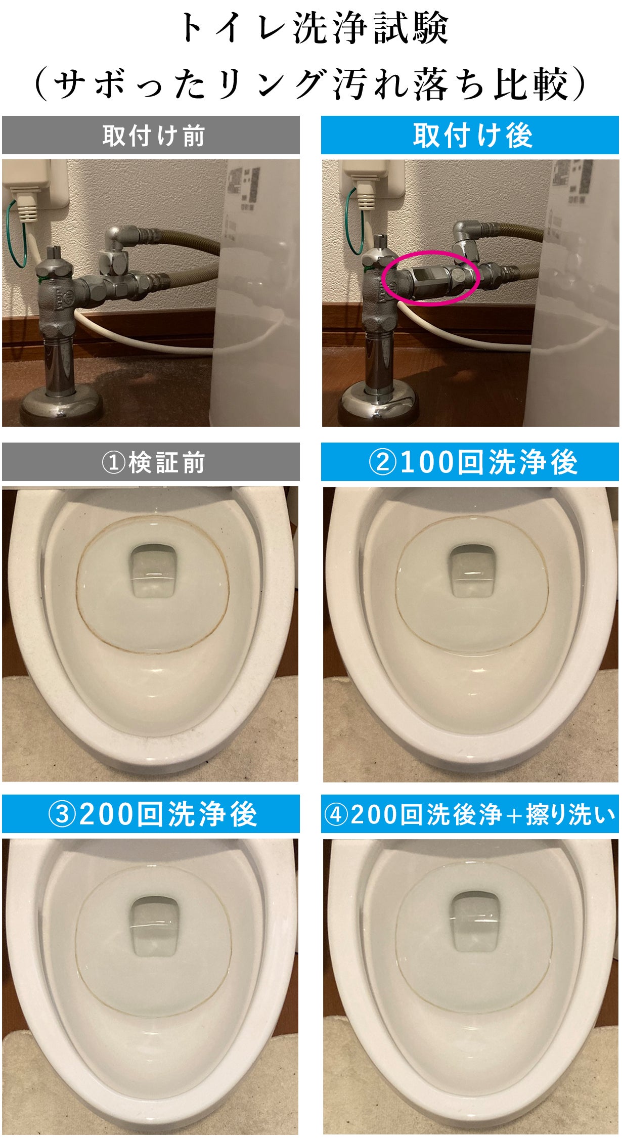 10ヶ月間掃除をしていない便器の黒ずみ・サボったリングの汚れ落ちを検証。本製品を止水栓に設置して、大洗浄で流した結果です。※自社試験(使用環境により、結果は異なる可能性がございます。)