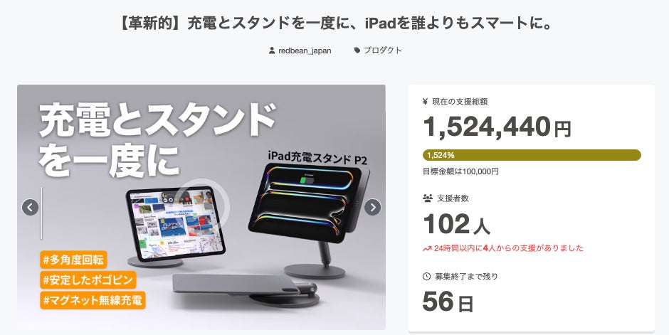 プロジェクト開始から2週間が経過し、現在の支援率は1524%に達しております。 これほど多くの皆様にご支援いただけておりますこと、心より感謝申し上げます。本製品『P2 iPadスタンド』は、iPadを置くだけでスマートに充電できる高機能スタンドです。充電端子への物理的な負担を減らし、見た目にも美しい設計で、日々の作業や映像視聴をより快適にサポートいたします。 現在、CAMPFIRE限定の特別価格にてご案内しており、より多くの方にお届けできるよう努めております。実際に支援者の皆様からは、- 「デザインが上質で、インテリアにも自然に馴染む」 - 「iPadの充電端子が壊れてしまったが、これは修理よりも現実的だった」 - 「少し高いけど、それだけの価値がある」といったお声をいただいており、すでに多くの方にご支持をいただいております。次回以降の活動レポートでは、使用例や実際の開封時の様子などもご紹介していく予定です。 引き続き、本プロジェクトをよろしくお願いいたします。