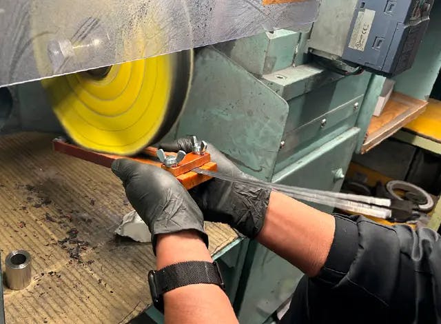 次に片面のヘアラインを入れるため、職人による磨きを行います。