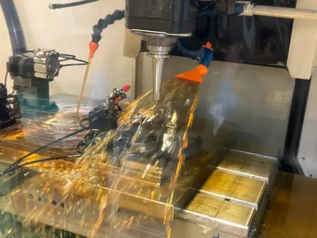 ヘアバンド両端にあるキャップの切削の様子。加工が非常に難しい純チタンに合わせ、特殊な油を使用します。