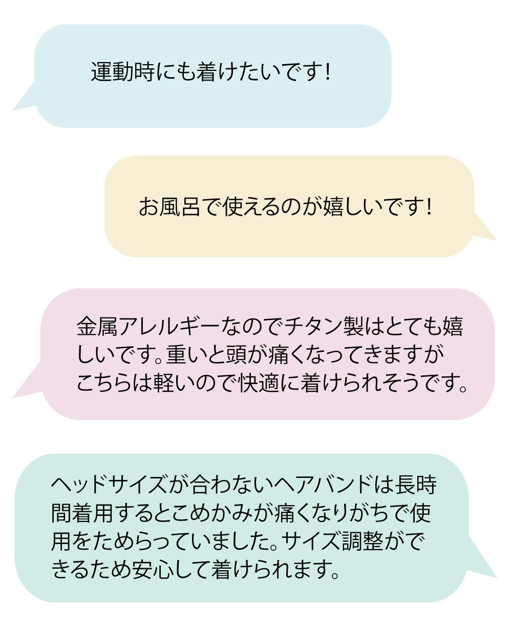 チタンの錆びにくく劣化しにくい性質を活かし、これまで金属製ヘアバンドを使えなかったさまざまなシーンで活躍します。