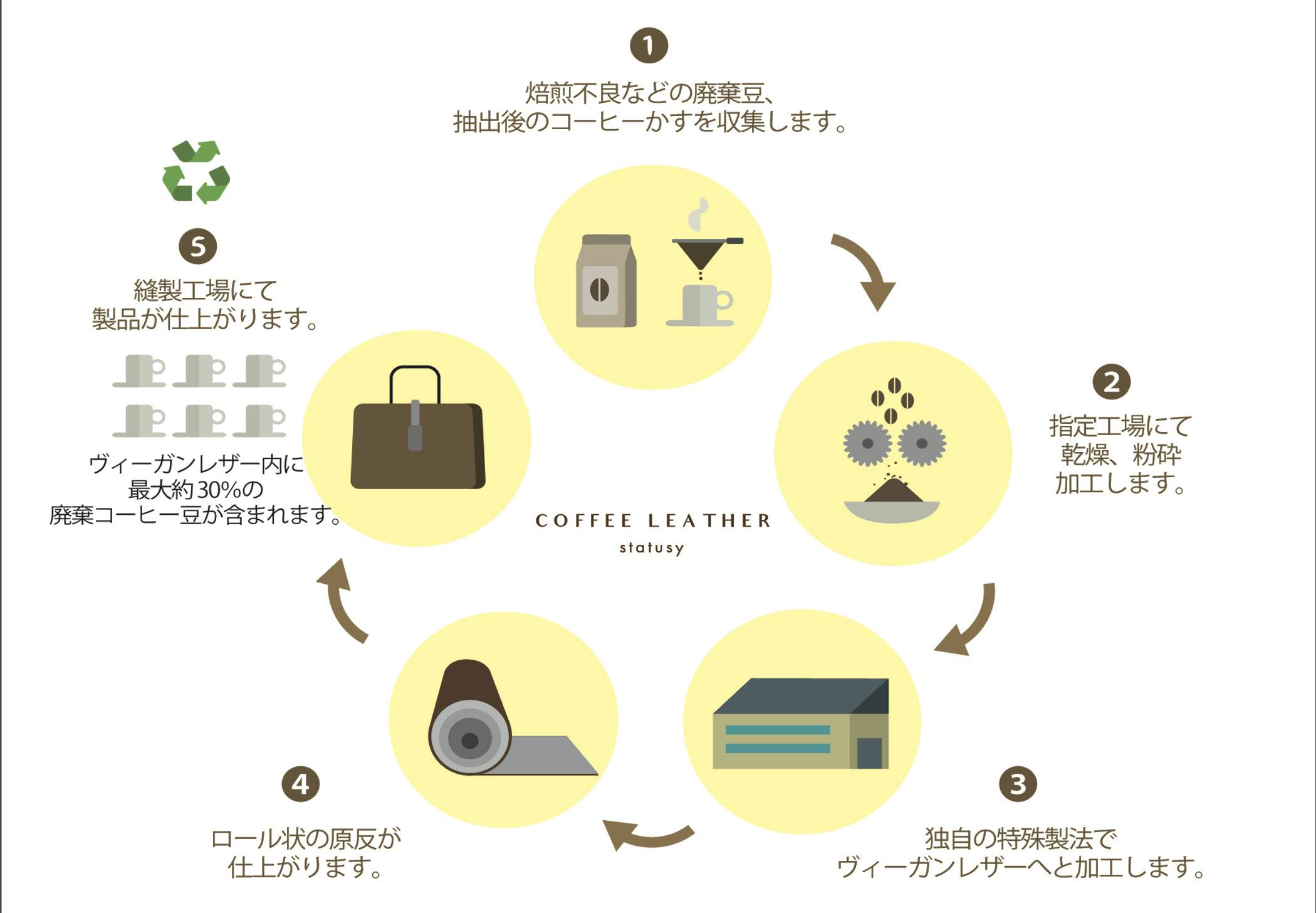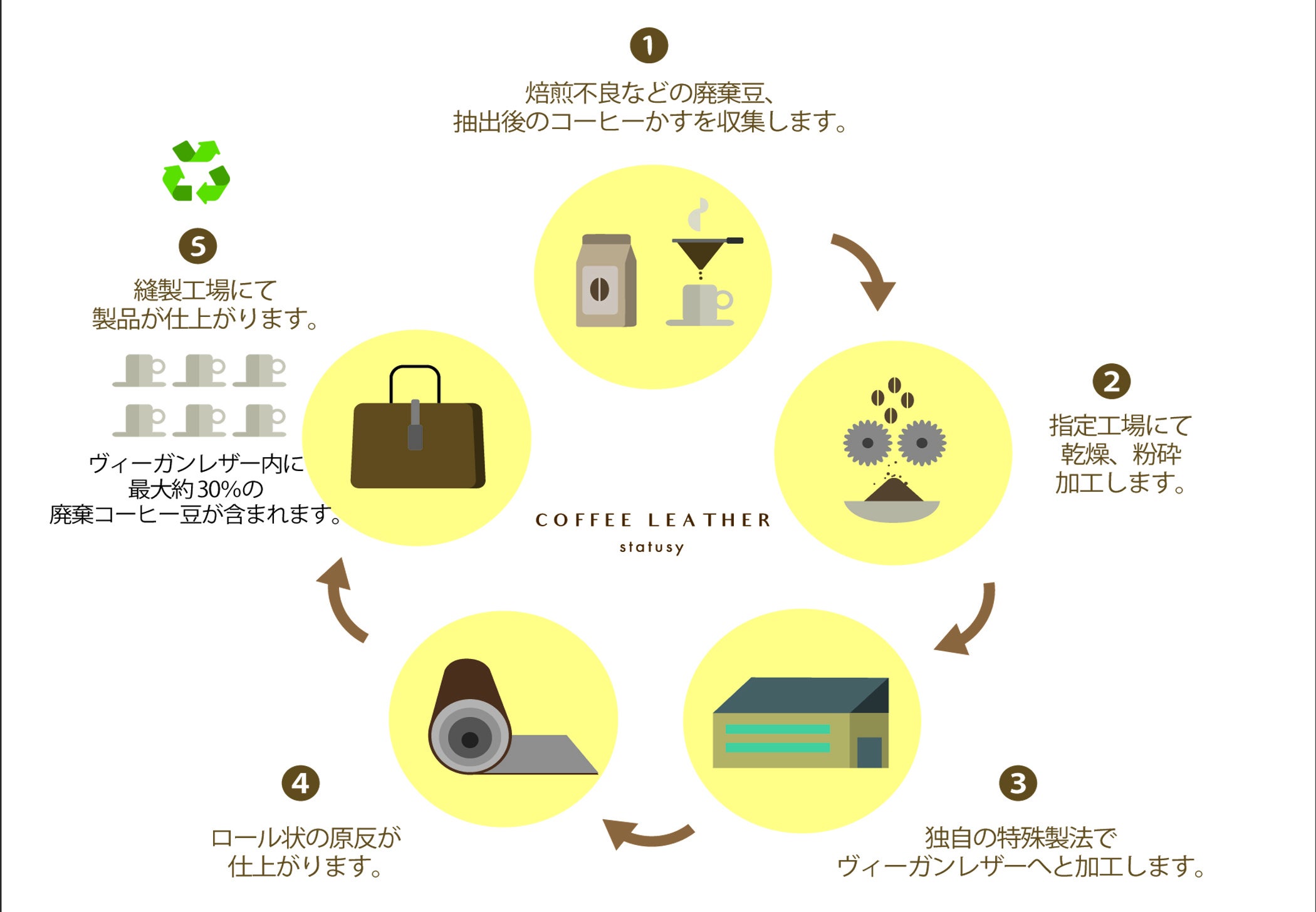 今回採用した素材「コーヒーヴィーガンレザー」とは、STATUSY(ステータシー)が独自に開発した人工皮革で、合皮の主成分(石油成分)の約30%を、廃棄されるコーヒー豆や抽出後のコーヒーカスに置き換えることで、石油の使用量と食品廃棄物の両方を減らすことを目的とした素材です。※日本国内特許取得済。