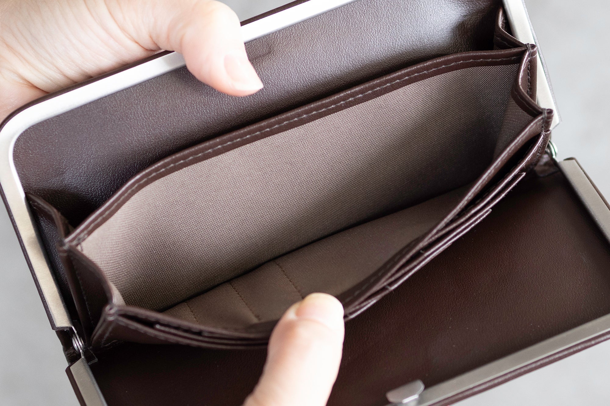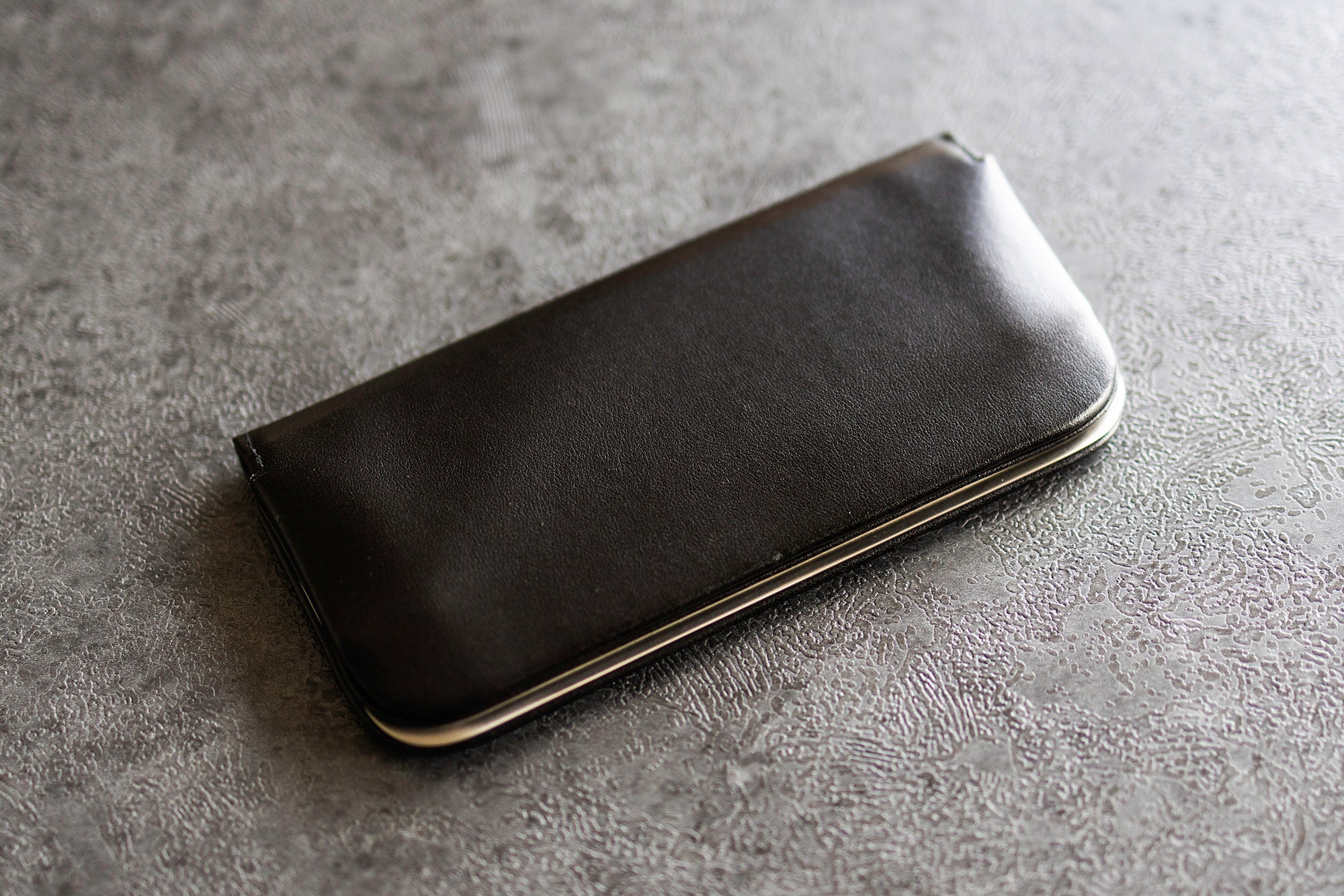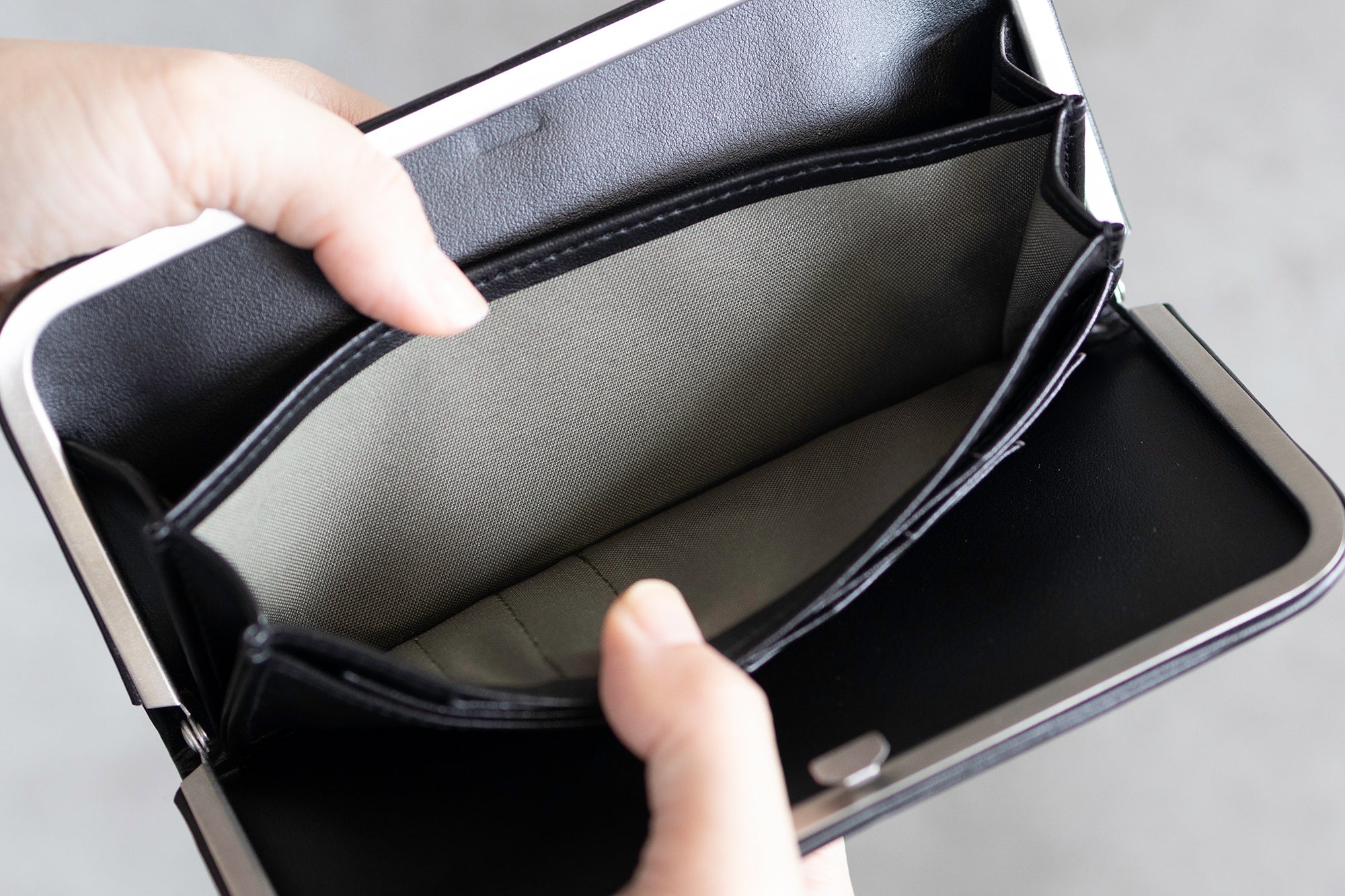 オリジナルでサイズ設計した天溝(てんみぞ)という口金を使用した長財布で、内部に隠された金属ボタンを外側から押すことで、片手でも容易に開封することが出来ます。