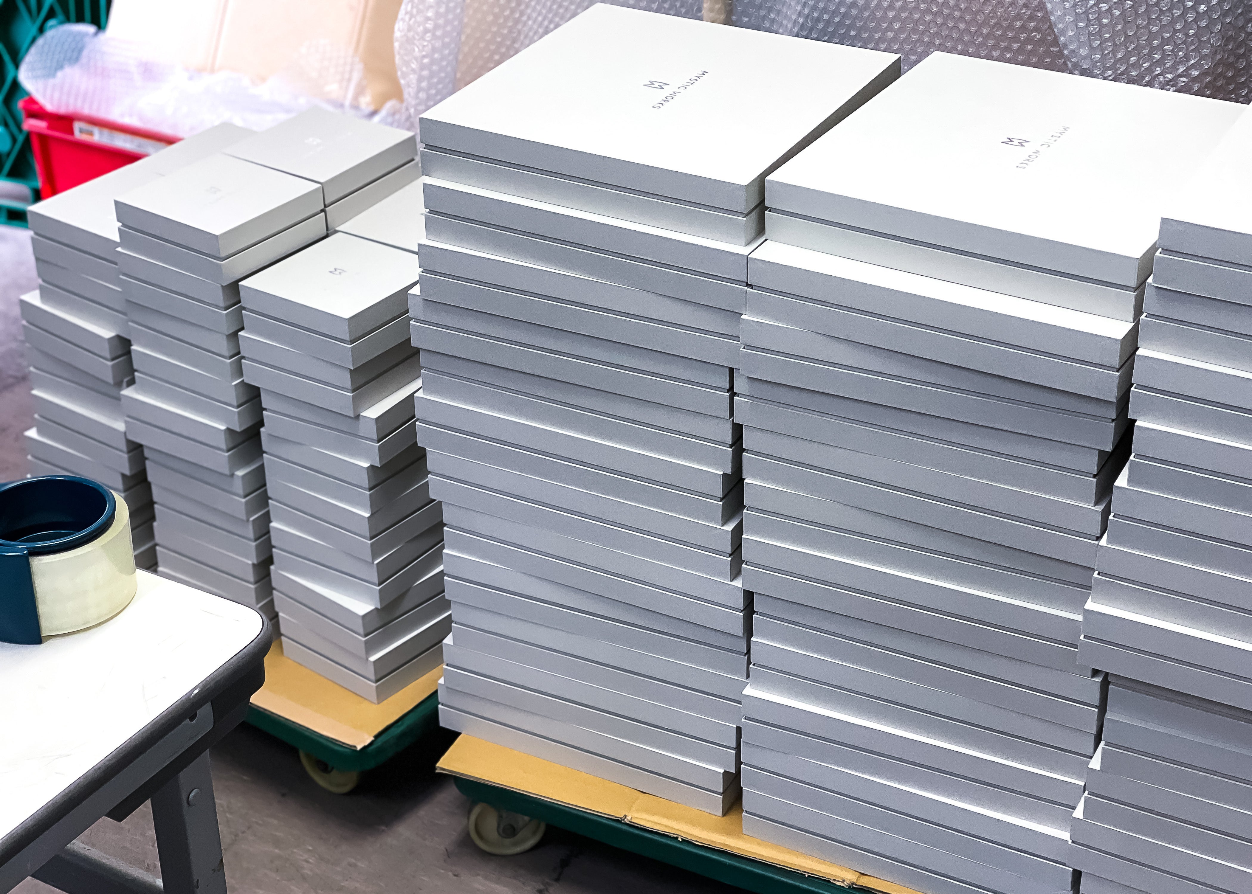 箱の製法は、以前店頭で見て個人的に関心があった「Vカット製法」と呼ばれる製法の箱を選定しました。貼り箱ながらエッジが際立つ形状が特徴的で、そうしたインダストリアルな雰囲気が、商品自体はもちろんのこと、町工場をルーツに持つ我々のブランドの雰囲気にもマッチすると考えました。