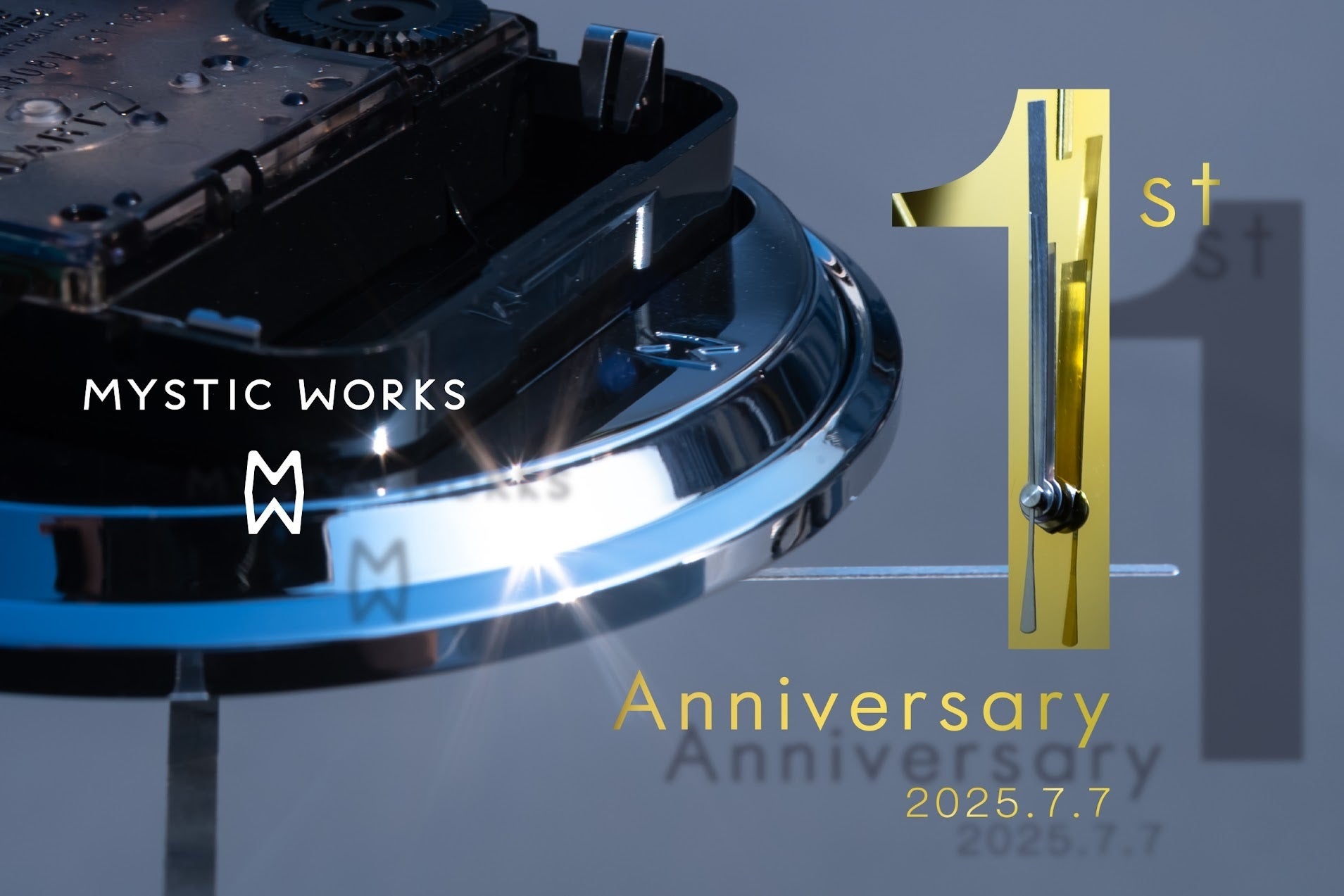 一周年記念ビジュアル/左のφ9cm掛け時計の型製作をこの1年で実現しましたという実績と、2年目からは時計針のオリジナル化!というMYSTIC WORKSの決意を込めました