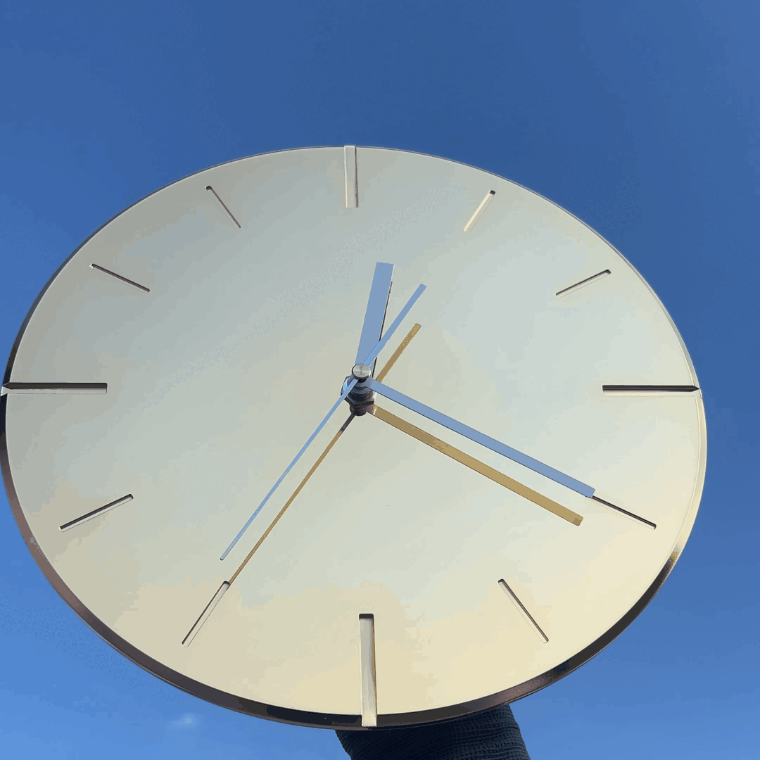 「ひかりを楽しむ掛け時計」は、裏面に至るまで“光”そのものを楽しんでいただけるよう設計されています。特に直径20cm以上のモデルでは、裏面も装飾的・構造的な要素を極力排除し、「非有効面」とされがちな部分すらも“見せる”デザインの一部=「有効面」として扱っています。そのため、凹凸のないフラットな裏面に仕上げることで、まるで鏡のように光を反射し、時計を裏返した状態でも美しさが損なわれない仕様を実現しています。