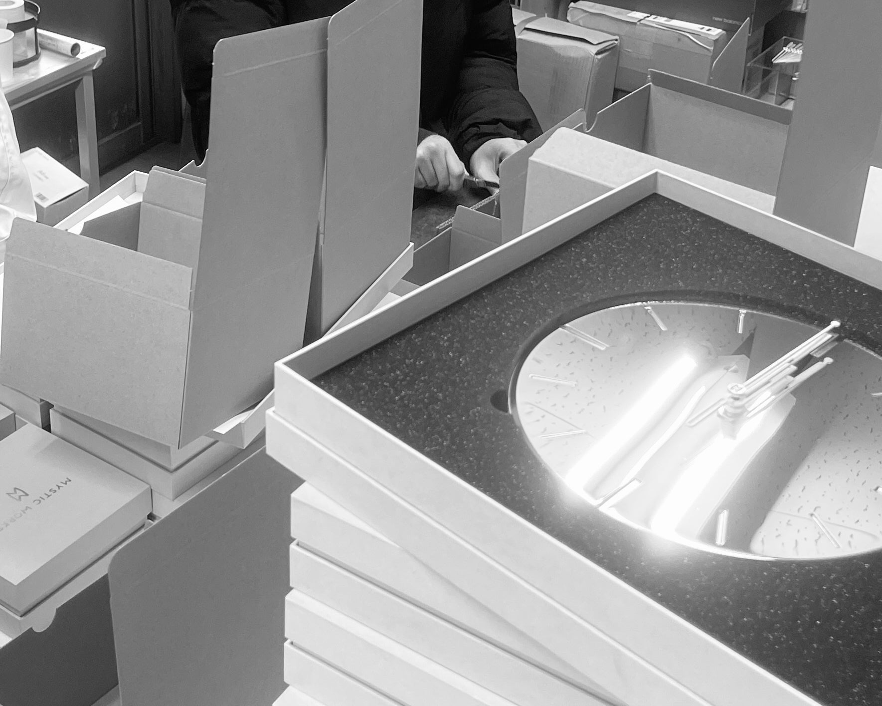 パッケージは商品現物よりも前にお客様の目に、手に触れる「ブランドの顔」ともいえる大事な要素です。さらに「ひかりを楽しむ掛け時計」はそこそこ値の張るアイテムなので、価格に見合うような、開封前のワクワク感を感じてもらえるような…そんなパッケージを目指しました。