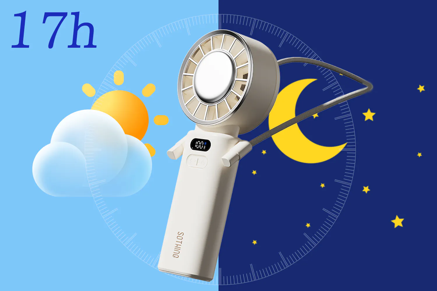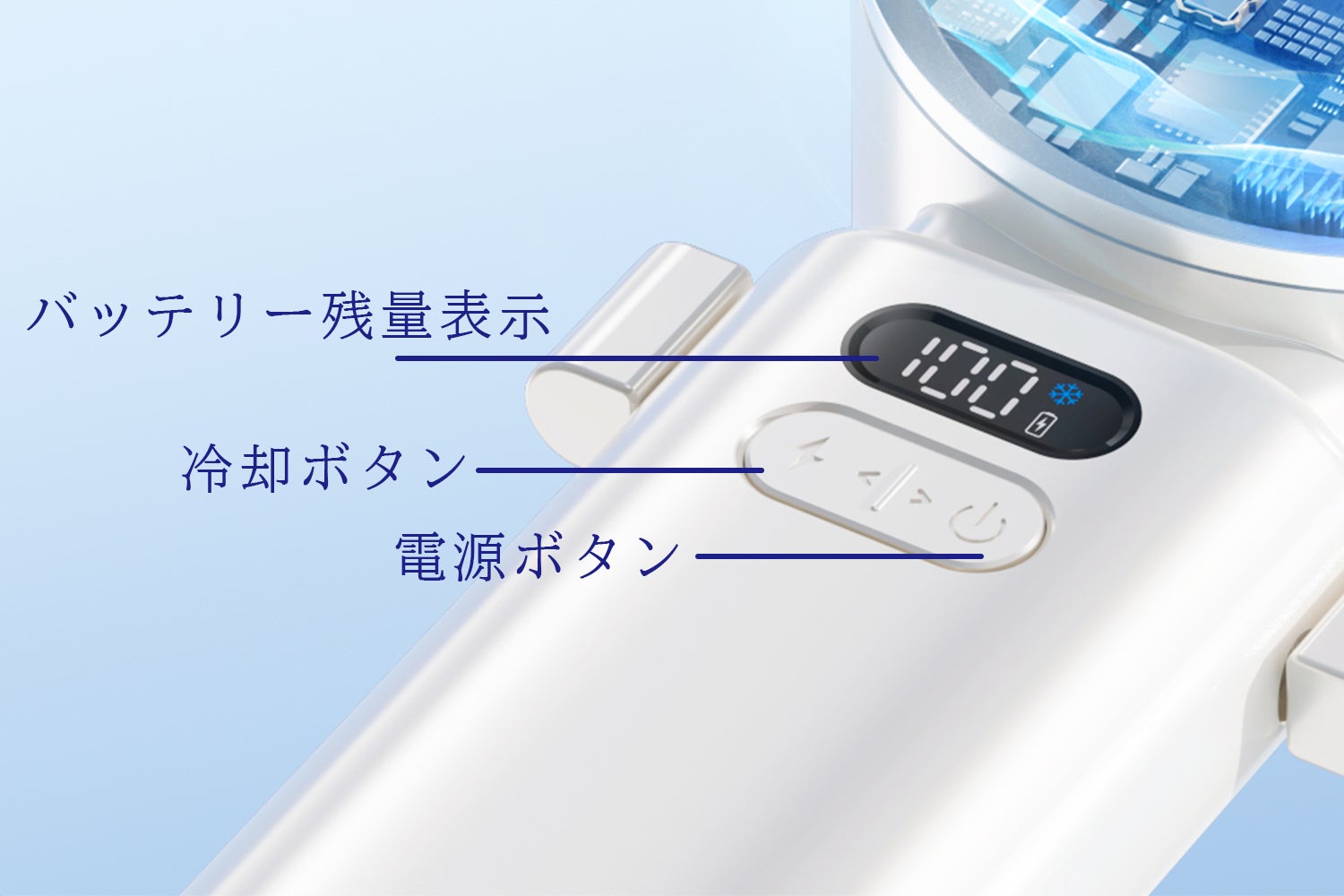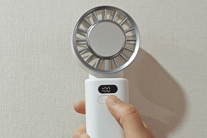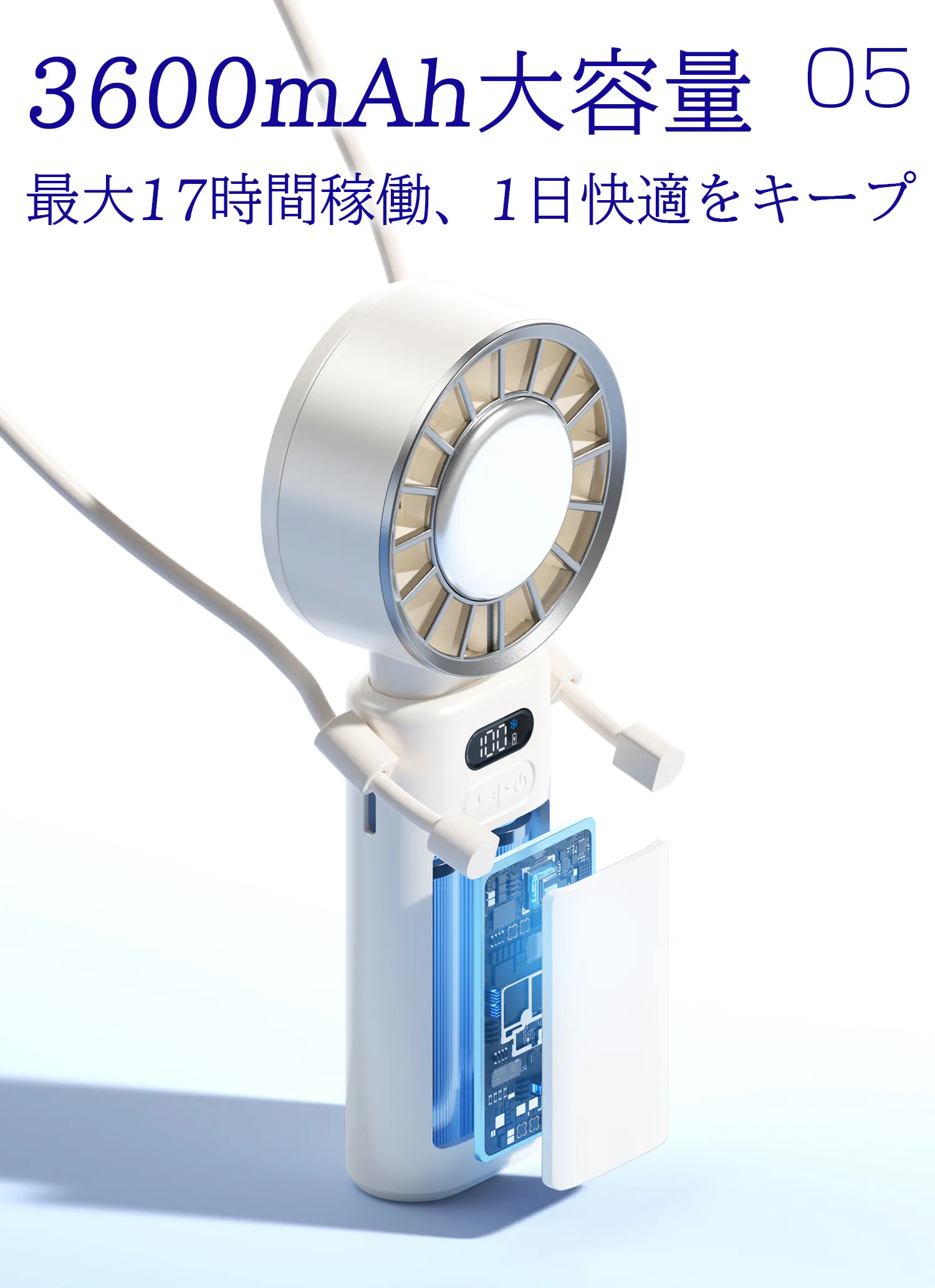 最大17時間連続稼働可能、朝から晩まで涼しさが途切れません!LEDディスプレーにバッテリーの残量が表示され、充電のタイミングも把握しやすい。