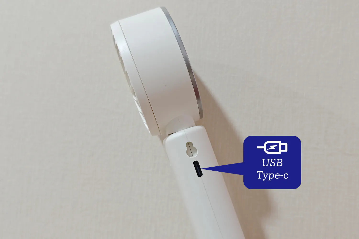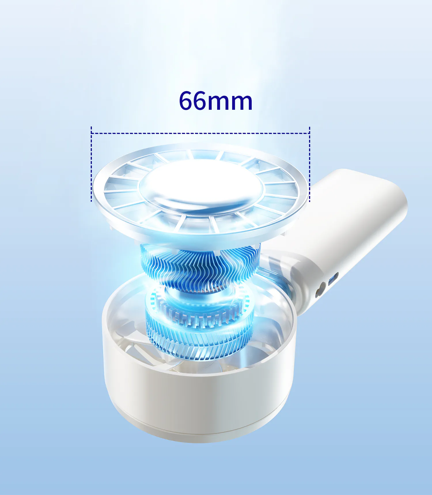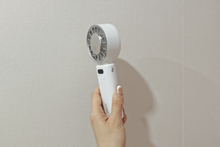 ハンディファンはではよく採用される50mm幅のものより、直径を132%アップしたことでより強力×広範囲な送風を実現。