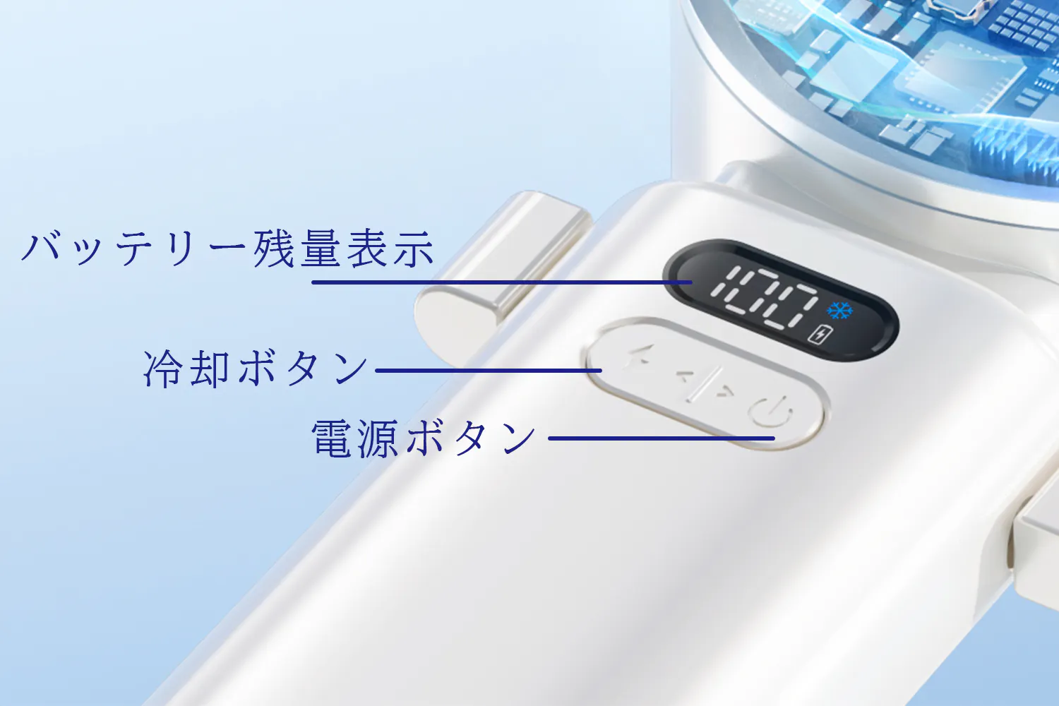 送風機能ON/OFF:電源ボタンを1回短押し、ON/OFFを切り替えます。