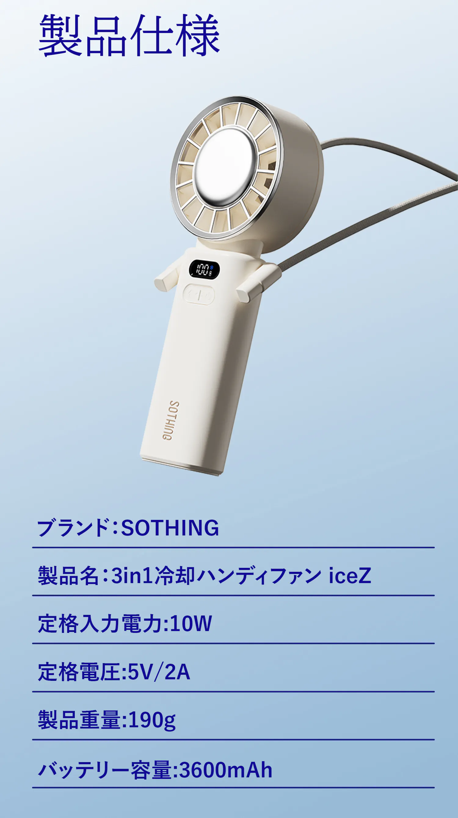 専用ストラップ付き、長さも簡単調節。手に荷物を持っても傘を差しても、iceZがしっかり涼風を届けます。