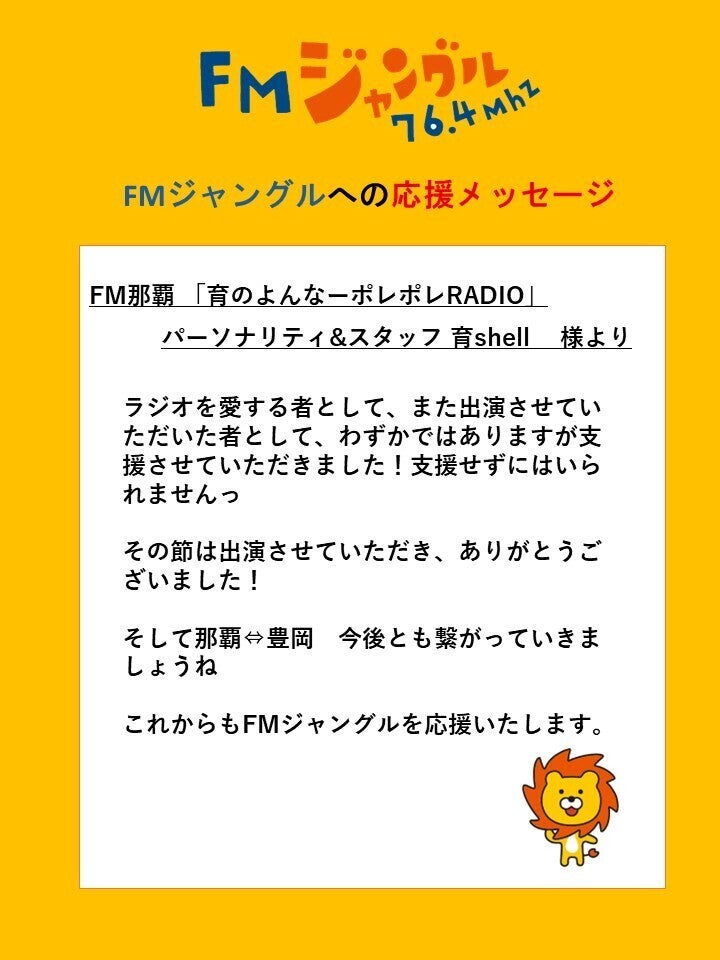 育shellさんは、FM那覇のパーソナリティーであり、素敵な唄い手でもあります。ご縁があって、那覇で唄い続けていらっしゃる『やちむん刺激茄子』のなすさんと共に、豊岡に二回ほど来てくださったことがあります。やちむんで育さんはコーラスをされています。一回目はお二人が出演されている『一生売れない心の準備はできてるか』の映画上映をきっかけに、豊岡劇場、まちの基地アンテナ、たけの太陽屋などでライブをしてくださいました。初めてお会いしたのにどこか繋がりを感じたのを覚えています。二回目はたけの海まちマーケットご出演のために来てくださって、海をバックに最高なライヴをしてくださいました。この時、FMジャングルにも寄っていただいて、ゲスト出演していただきました!色紙にサインをいただいたのですが、育shellさんからは「ラジオでリスナーさんを元氣に!」とメッセージが書かれています。FMジャングルkazmyも、FM那覇の『育のよんなーポレポレRADIO』にゲスト出演させていただきました。唄い手であること、移住者であること、猫を愛していることなど、共通点が多く、繋がりを感じるとともに、リスペクトしています。大きな愛で溢れている育shellさん。那覇で保護猫活動も頑張っていらっしゃいます。乳飲み子の子猫たちを抱えて資金繰りも大変な時であるにも関わらず、あたたかな支援をしてくださいました。育shellさんの番組でも、FMジャングルを応援してくださっています。それを聴いたリスナーさんから、「育さんがジャングルの応援してましたよ!」と教えてくださいました。こうしてリスナーさんが、FM那覇もFMジャングルも両方聴いてくださるようになったことも嬉しいです。この度は、あたたかいご支援、誠にありがとうございます。これからも育shellさんと、FM那覇を応援しています。ラジオでリスナーさんを元氣に!FMジャングル一同頑張ってまいります