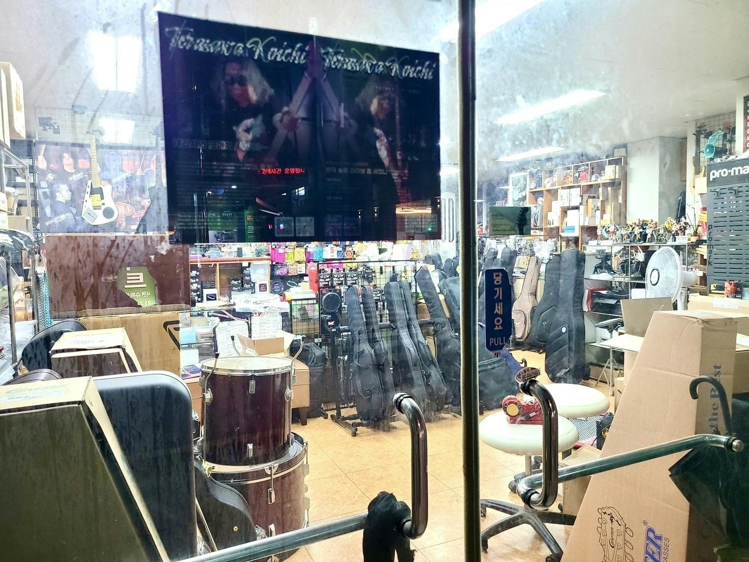 この写真は釜山にある楽器店です。フライヤーを貼っていただきました!(光の加減で少しわかりにくいですが…)スタッフのキム君には、このあとも頑張ってもらいます!