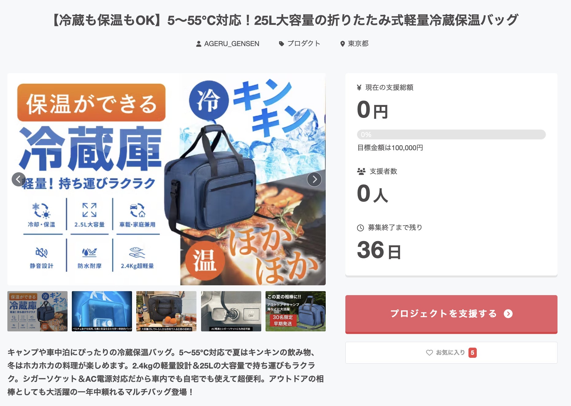 ご支援者の皆さまへこのたびは、「5〜55℃対応!一年中使える冷蔵・保温バッグ」プロジェクトにご支援いただき、誠にありがとうございました。2025年6月19日からスタートした本プロジェクトは、349名の皆さまから総額6,001,262円という想定を大きく上回るご支援をいただき、目標金額の2000%を達成して、7月31日をもちまして無事に終了いたしました。皆さまからの温かい応援に、心より感謝申し上げます。購入いただけなかったお客間に朗報!!!今回、machi-yaで購入いただけなかったお客様がおりましたらCampfireの方で購入が可能となりました!購入を検討しておりましたお客様は是非、下記リンクからご購入ください!https://camp-fire.jp/projects/872354/view※ご不明点がございましたら、お気軽にメッセージよりご連絡ください。AGERU厳選ショップスタッフ一同