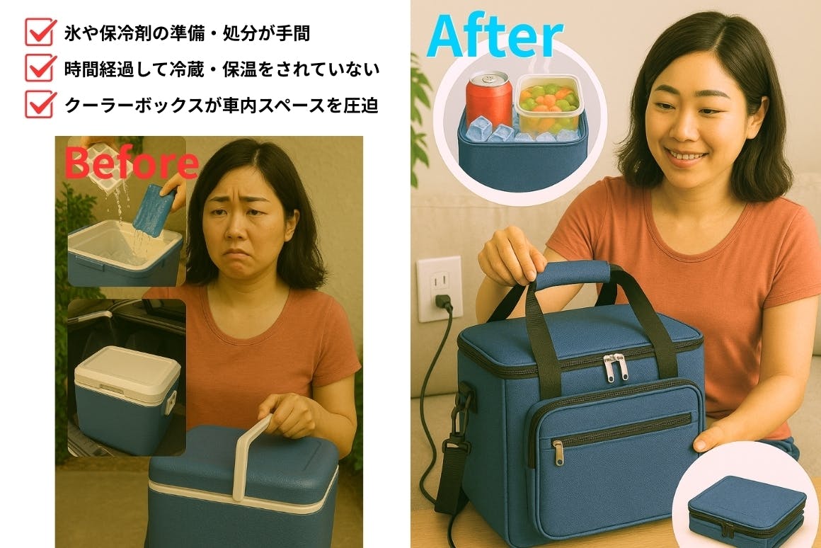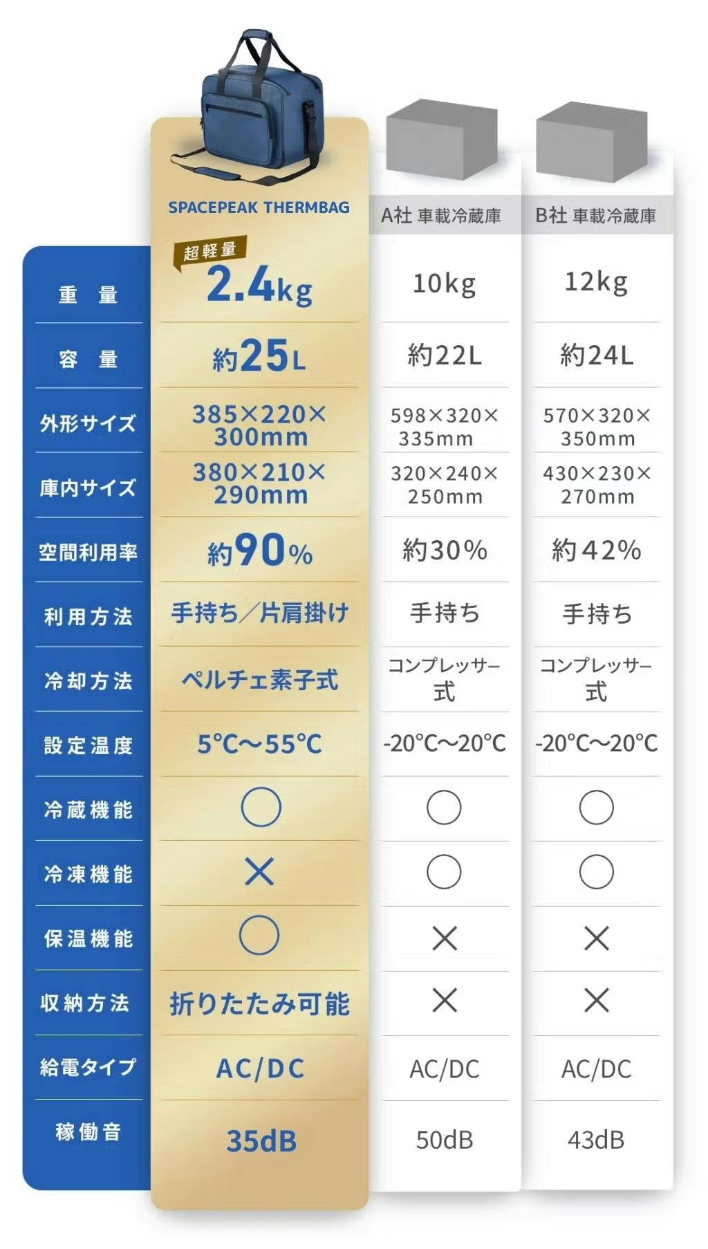 従来のコンプレッサー式に比べて圧倒的に軽量。さらに、内部スペースを最大限に活かす設計で、収納効率はなんと90%超え!キャンプ・ピクニック・スポーツ観戦まで、これ一つでアウトドアがもっと快適に。