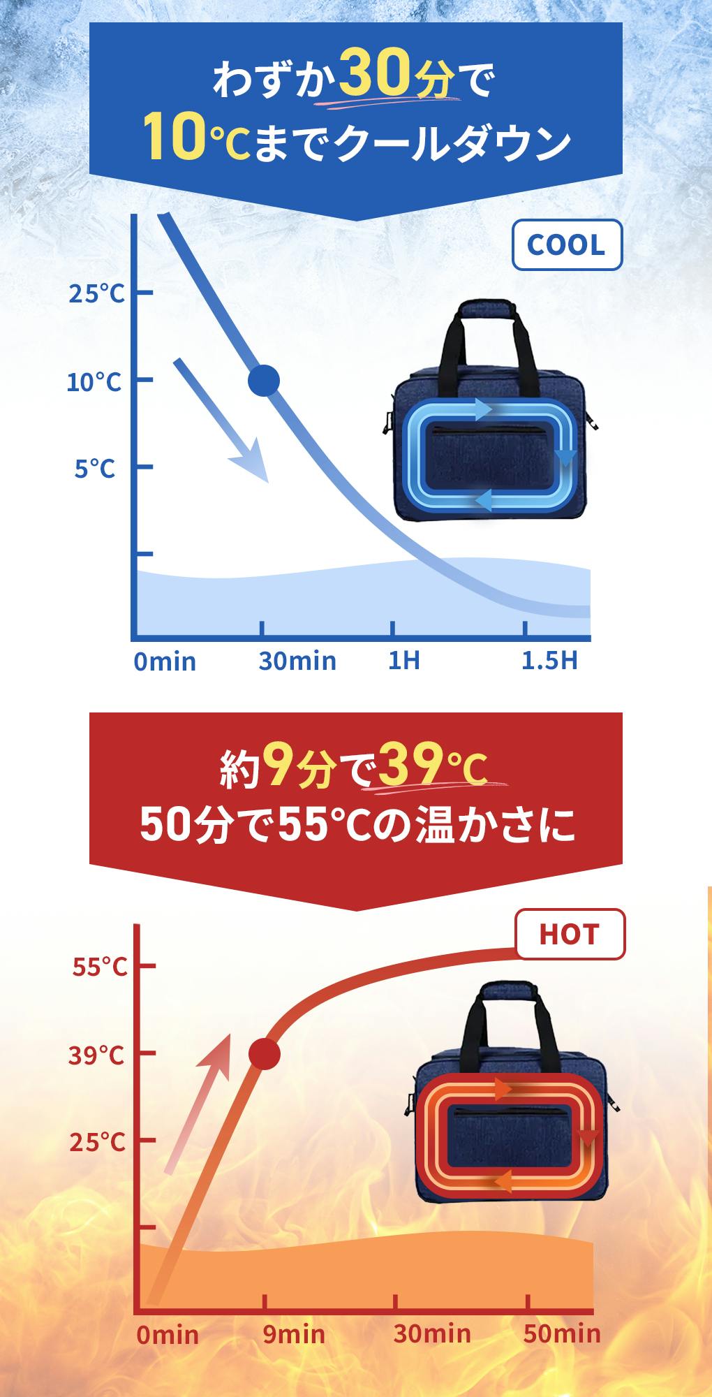 ●わずか30分で10℃まで冷却・約9分で39℃まで加熱