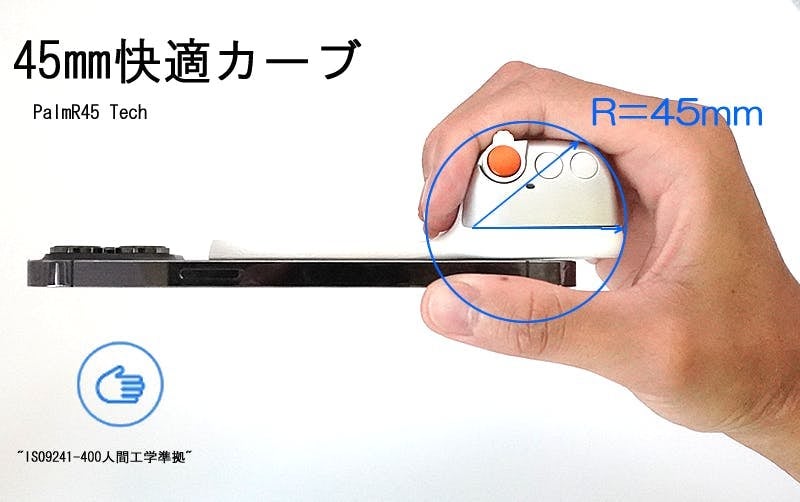 グリップ曲率半径45mm手関節が最適位置で握る事が出来ます。"ISO9241-400人間工学準拠"