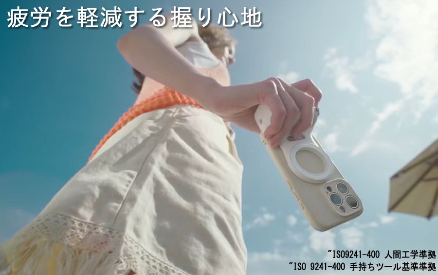 手になじむ曲面デザイングリップで長時間撮影でも疲れず片手で安定操作が可能。その洗礼されたデザインと機能性はISO(International Organization for Standardization国際標準化機構)の"ISO 9241-400 手持ちツール基準準拠"及び"ISO9241-400 人間工学準拠"いたしております。