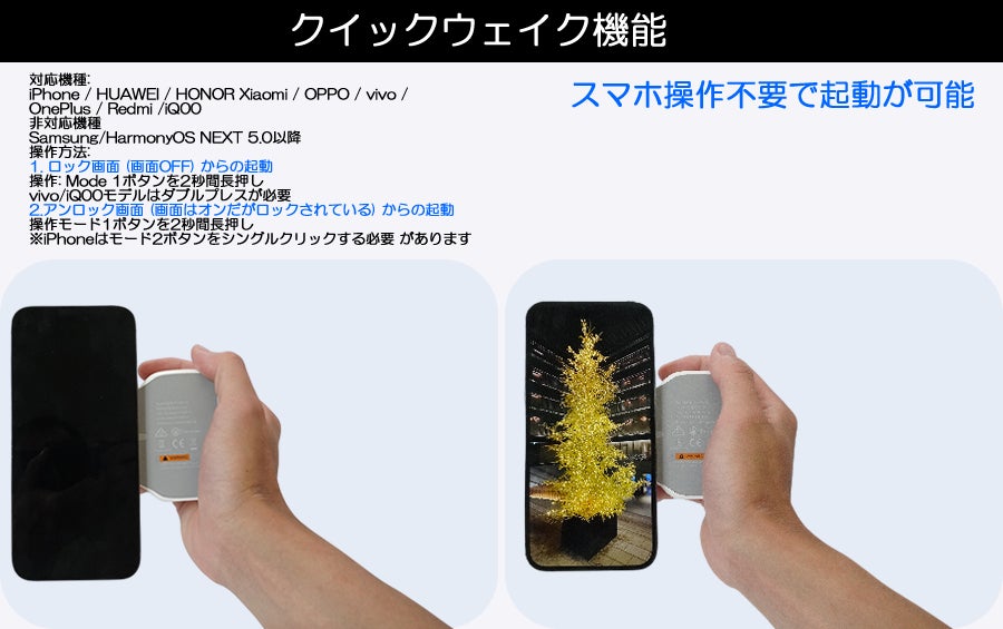 スマホが一眼レフのようにズーム、ピントフォーカス、シャッター撮影が片手操作で行えるようになり、一瞬のシャッターチャンスを逃さず楽しんでいただく事が出来ます。
