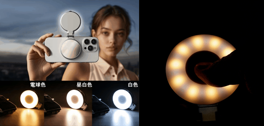 10個の高輝度ビーズを搭載し電球色、昼光色、昼白色三種類光色が備えたマグネット式リングライト!!