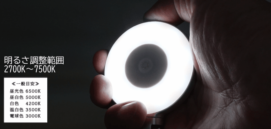 小型ながらも7500Kの明るさを発揮致します。スマートフォンライトのような直線的な明かりと違って、幅広い範囲を照らすので自然な雰囲気でやんわりした雰囲気の撮影が行えます。