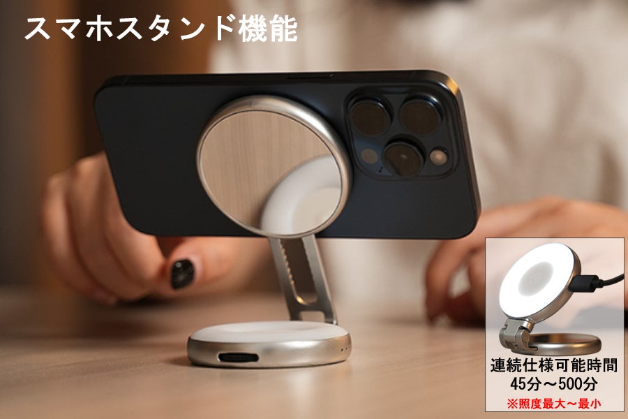 スマホクリップに取り付けない場合はスマートホンに直接装着しスマホスタンドとしてお使い頂けます。本体には5000mAhの大容量の電池が内蔵されており最大輝度使用時で連続45分の仕様が可能。最小輝度使用時で500分の連続使用が可能になっております。