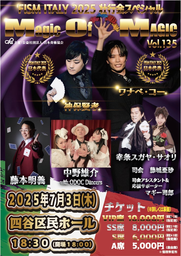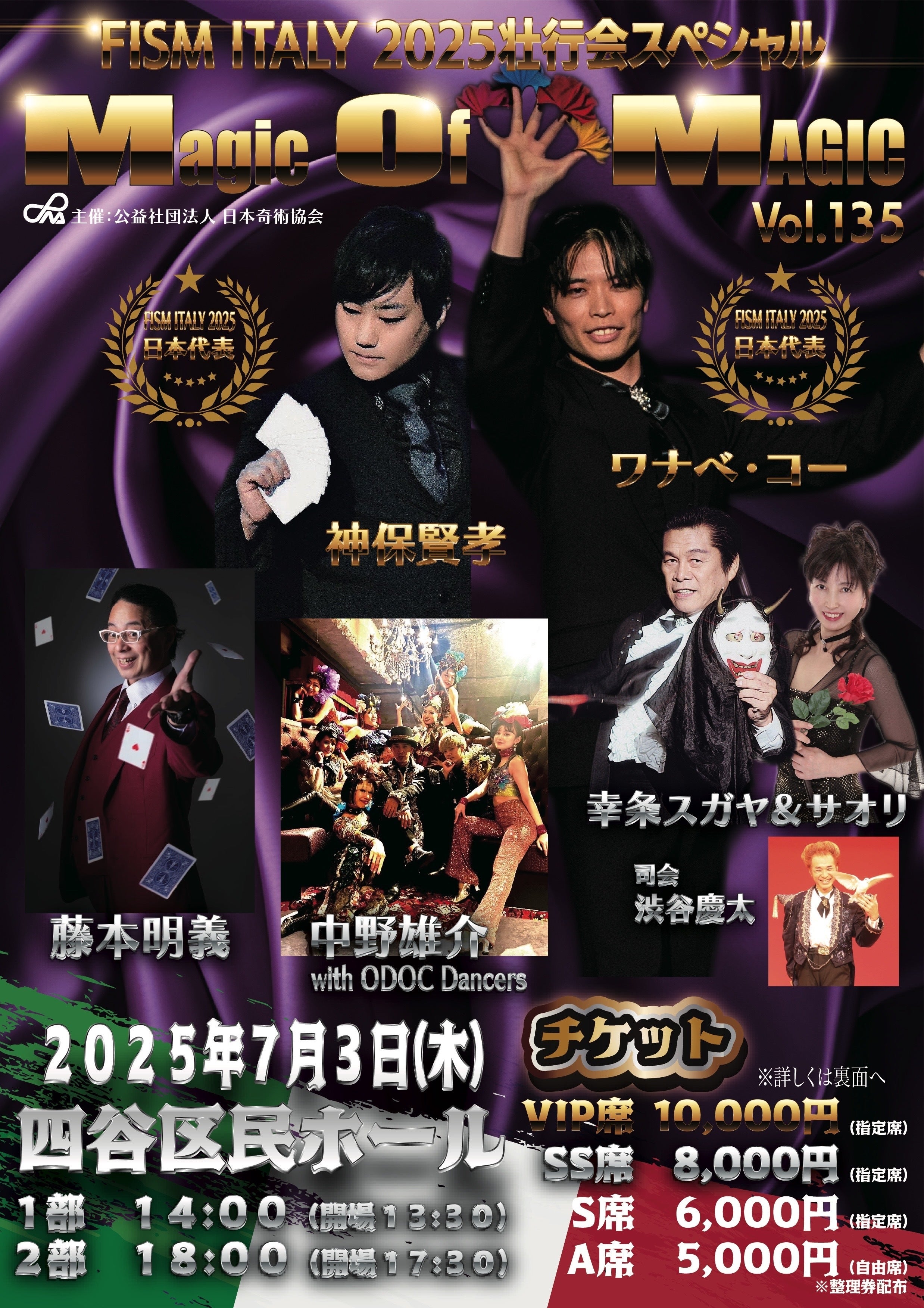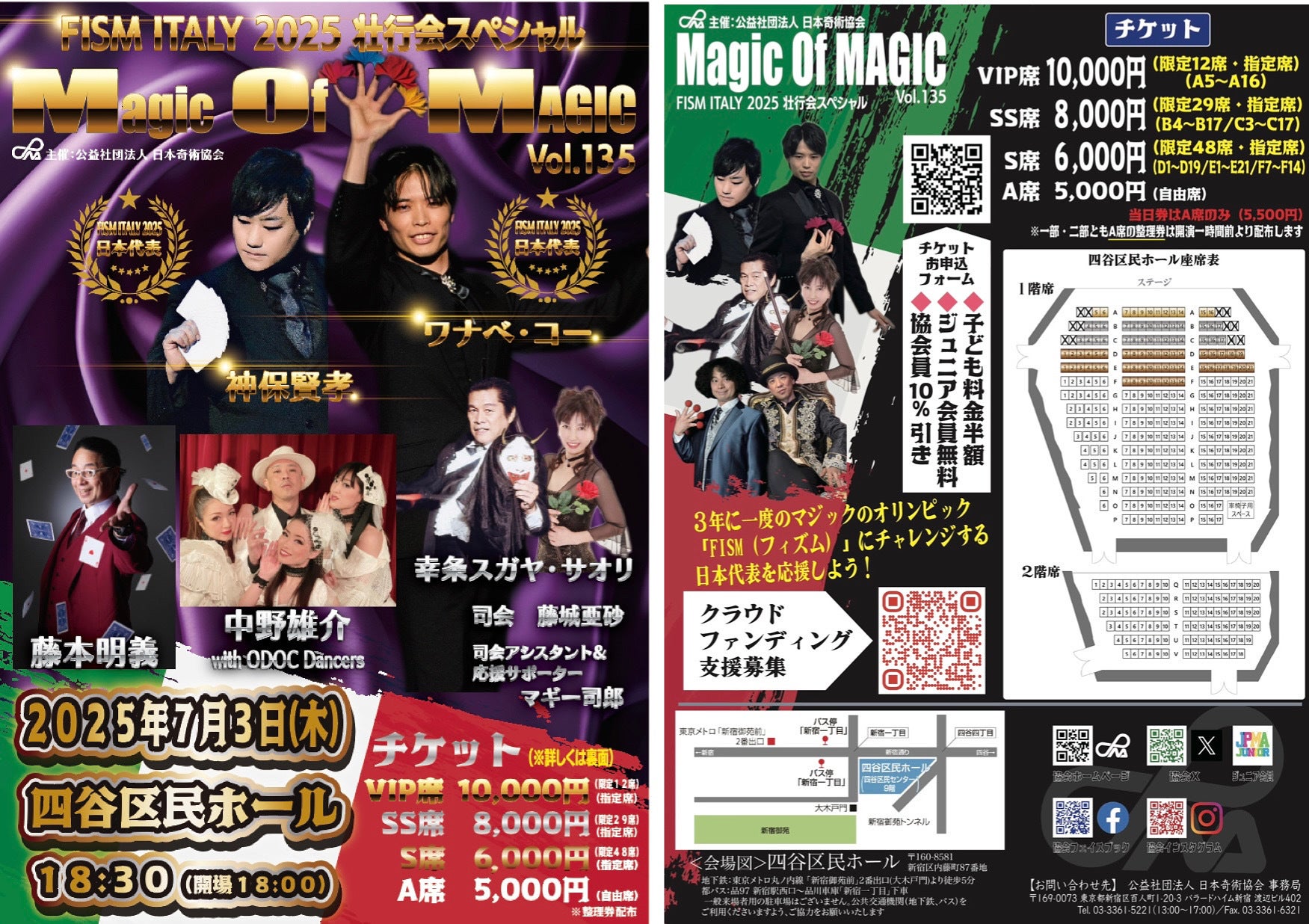 ご支援くださった皆さまへこのたびは、「FISM(マジックのオリンピック)」に出場する日本代表マジシャンを応援するクラウドファンディングにご参加いただき、誠にありがとうございました。おかげさまで、6月30日にプロジェクトが無事終了し、ネクストゴールまで達成することができました!皆さまからの温かいご支援と応援が、大きな力となりました。心より感謝申し上げます。今回のクラウドファンディングは、FISMに挑戦するマジシャンたちへのサポートはもちろん、7月3日に開催する壮行会イベントにも充てさせていただいております。このイベントは、FISM出場を控えた日本代表マジシャンたちの壮行会を兼ねた特別なマジックショーです。皆さまのご支援によって実現することができました。当日は、出場者による演技や、ご支援への感謝を込めたセレモニーなども予定しております。直接お越しいただける方は、ぜひ会場で一緒に盛り上げていただけたら嬉しいです。今後は、リターンの準備やFISM本番に向けた動きなども、この活動報告にて随時ご報告させていただきます。改めまして、プロジェクトに関わってくださったすべての皆さまに、深く御礼申し上げます。本当にありがとうございました。Magic of MAGIC Vol.135FISM ITALY2025壮行会スペシャル日時:2025年7月3日(木)18:30〜会場:四谷区民ホール(東京メトロ丸の内線 新宿御苑前駅より徒歩5分)出演:FISMアジア代表マジシャン:神保賢孝さん、ワナベ・コーさん 応援マジシャン:幸条スガヤ・サオリさん、藤本明義さん、中野雄介さん応援パフォーマー:keikoさん、ヒラクさん応援サポーター:マギー司郎さん