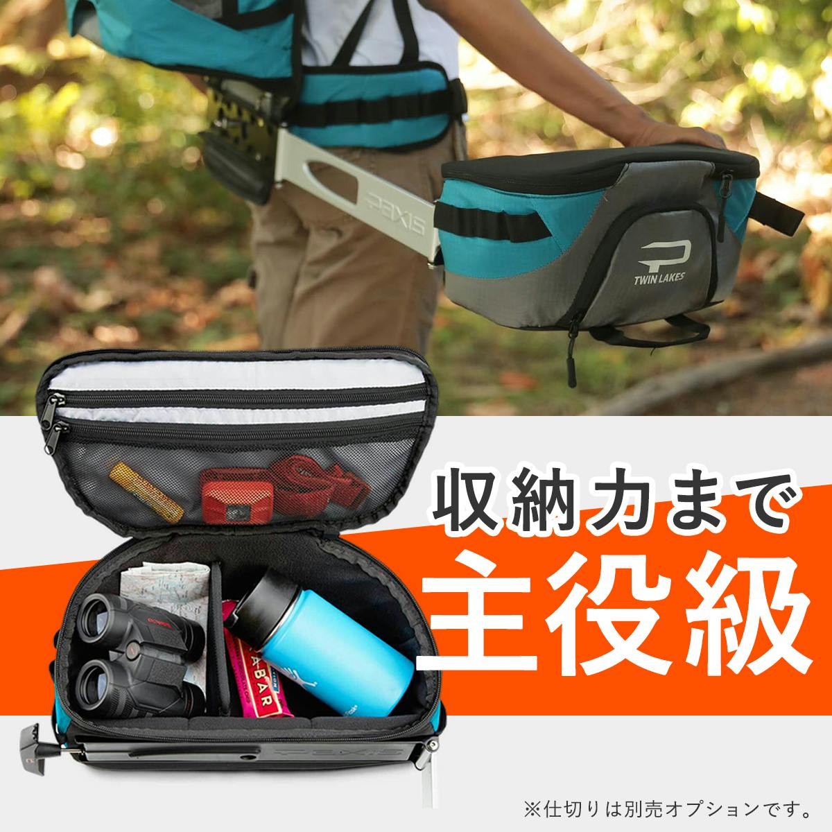スマホ、カメラ、釣具、小物——そして、ミルクボトルやおやつ、おむつまで。“すぐ使いたいもの”は、このひとつにまとめて収納。別売オプション「ポッドアーマー」を使えば、用途に合わせて自由に仕切りをカスタマイズできます。