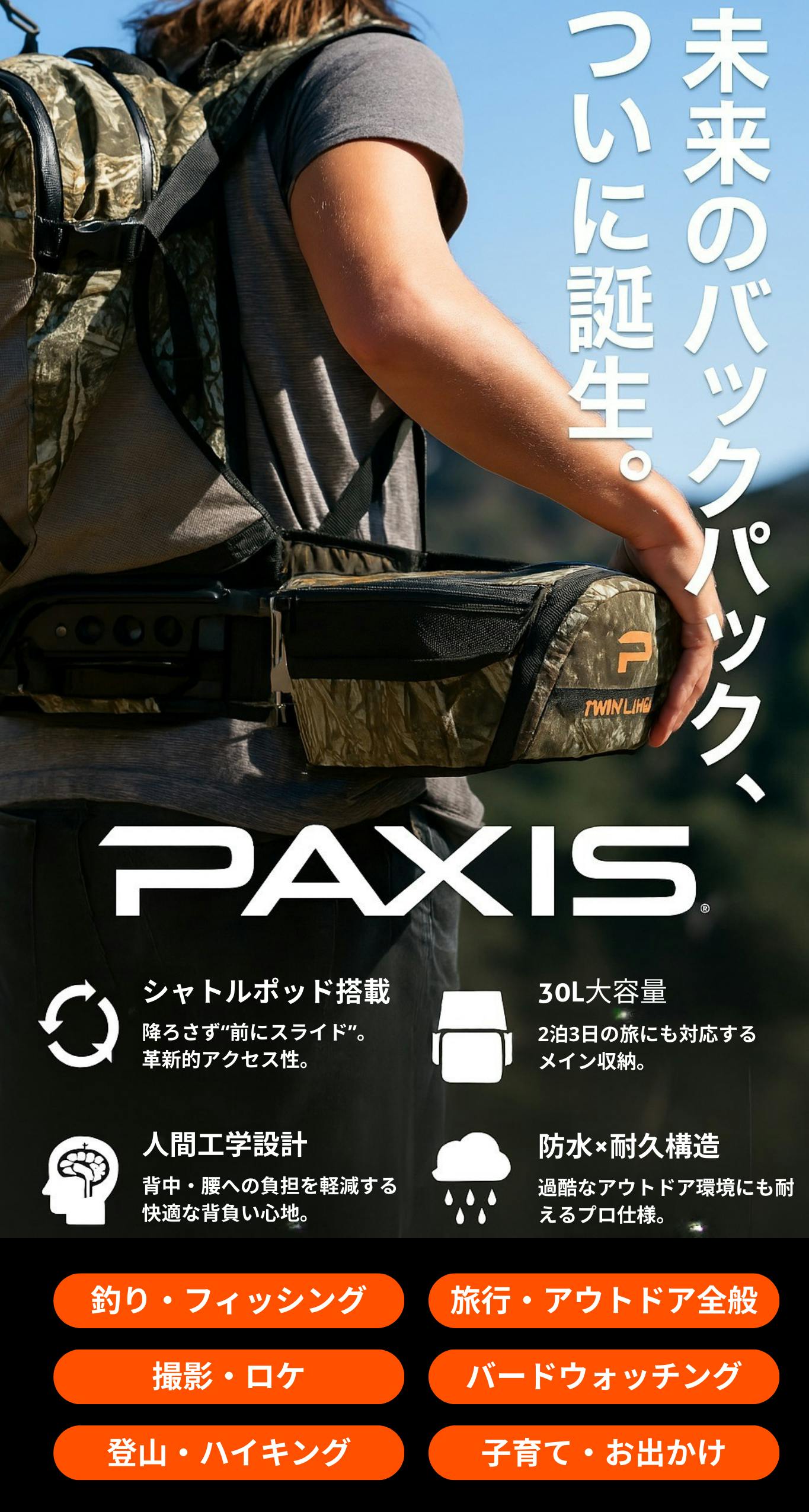 A. PAXIS Twin Lakesは、移動中でも荷物に素早くアクセスできる特許取得の「ARCスイング構造」を搭載したバックパックです。登山、バードウォッチング、ネイチャーフォトなど、「すぐに取り出したい!」という瞬間にぴったりです。