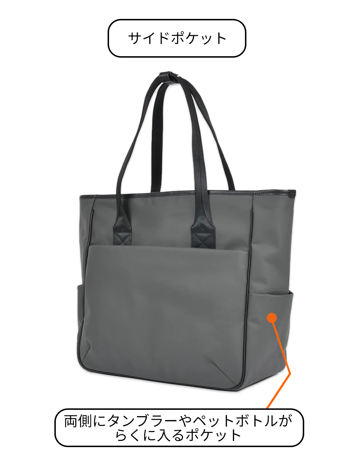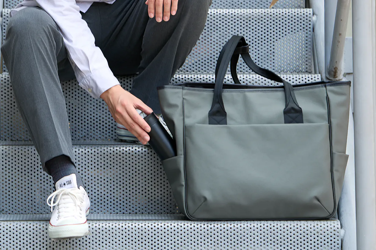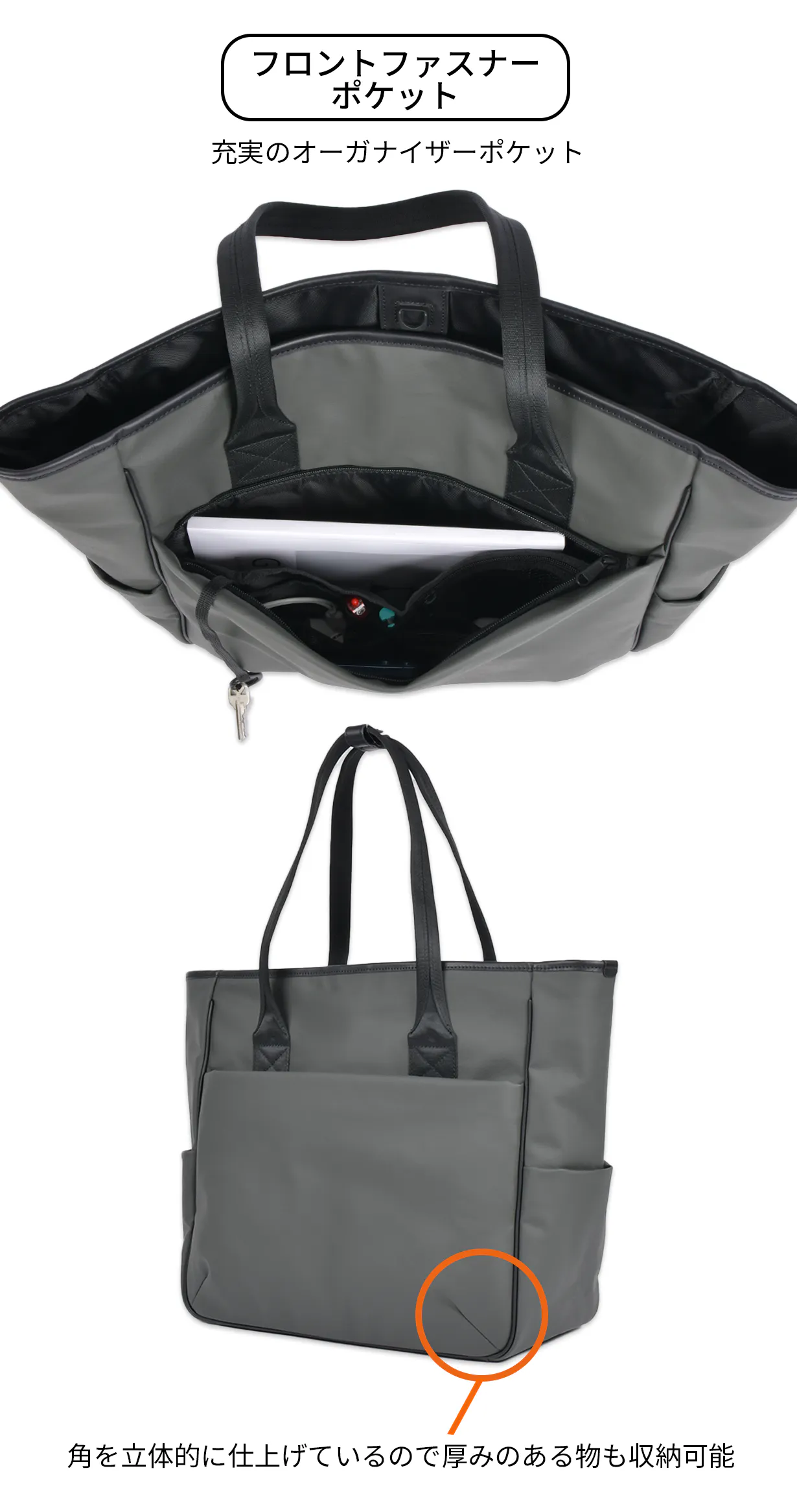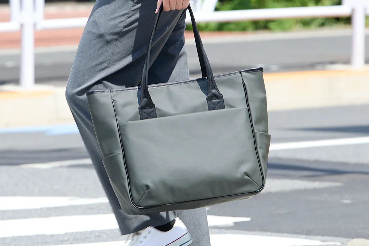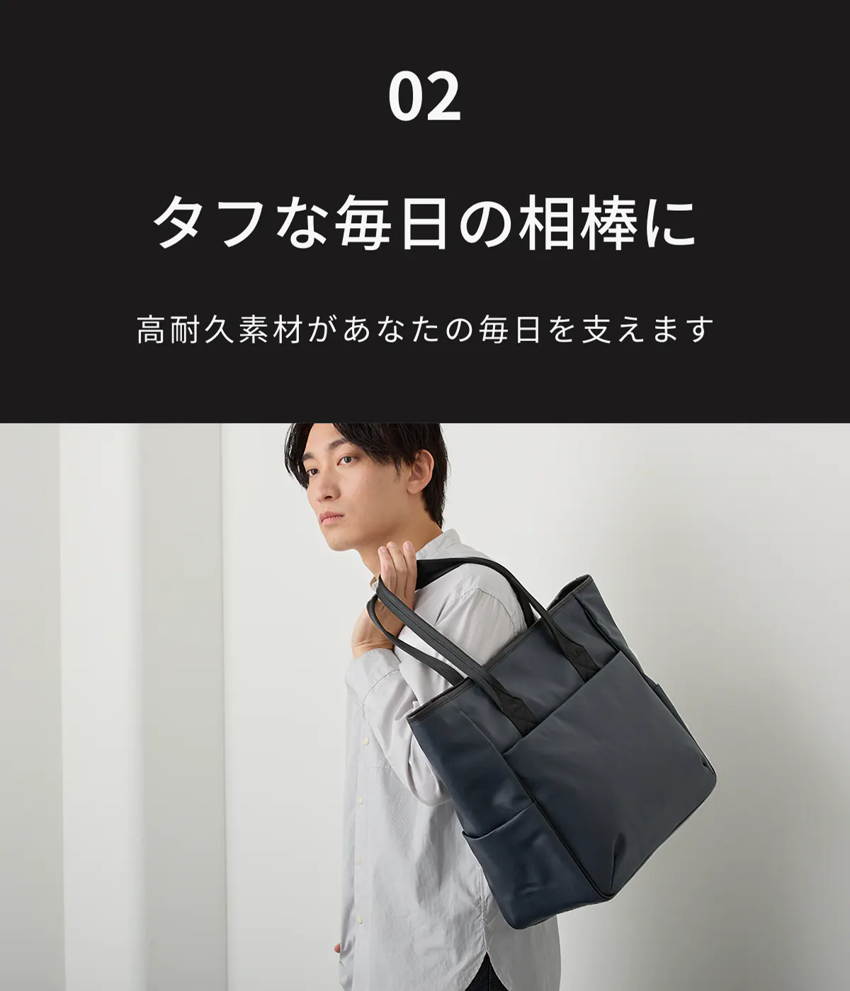 キャンバストートならではのざっくりと使えるメイン収納の大容量はもちろん、充実の小分けポケットでビジネスシーンにもしっかり対応します。