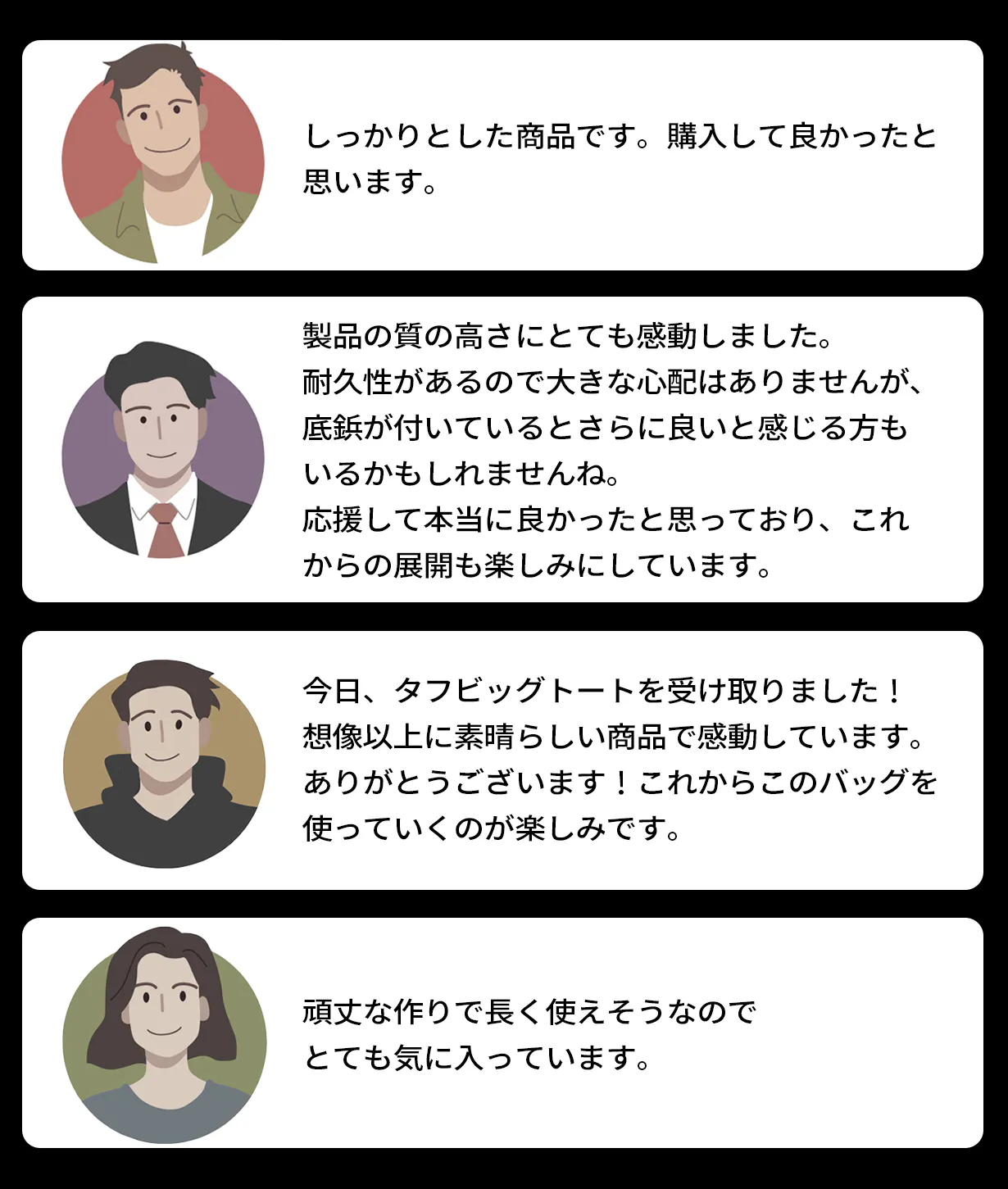 一人でも多くの方にタフビッグトートをお届けでき、気に入って毎日使って頂けると嬉しいです。