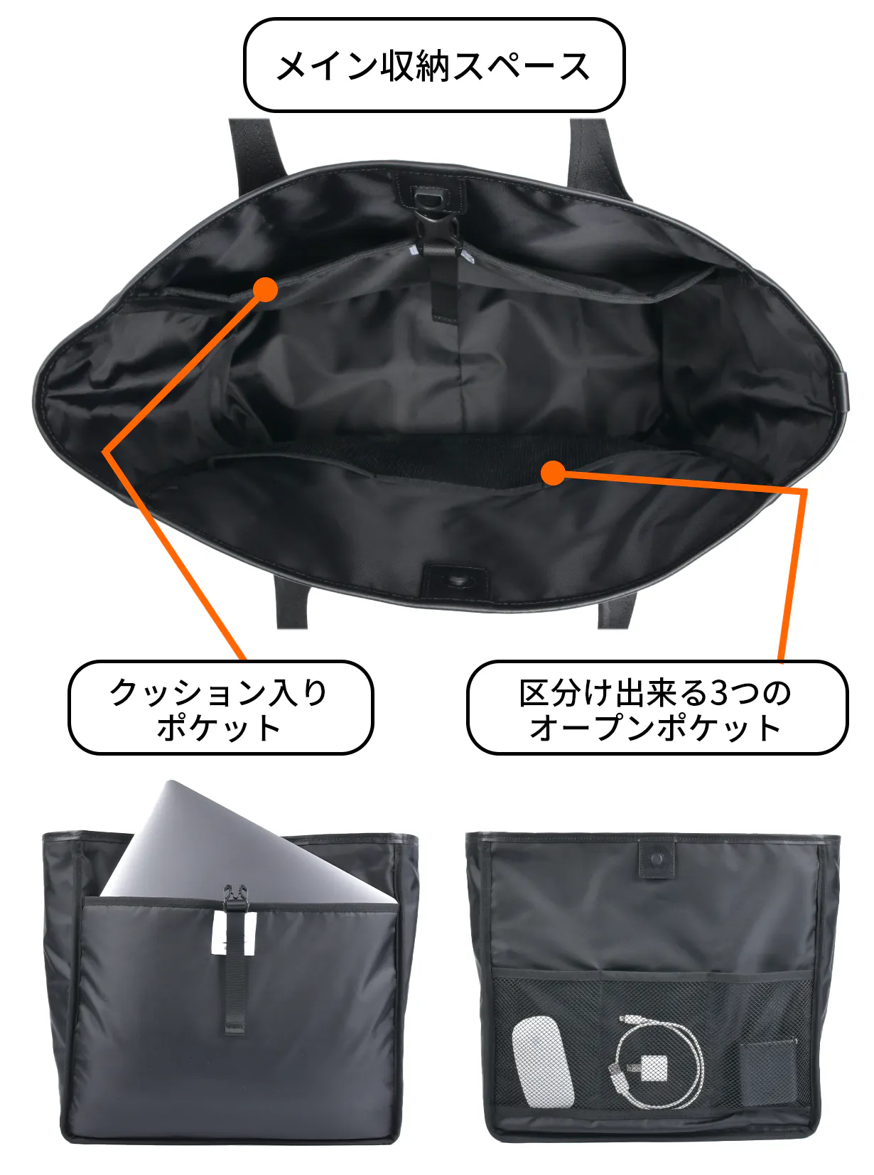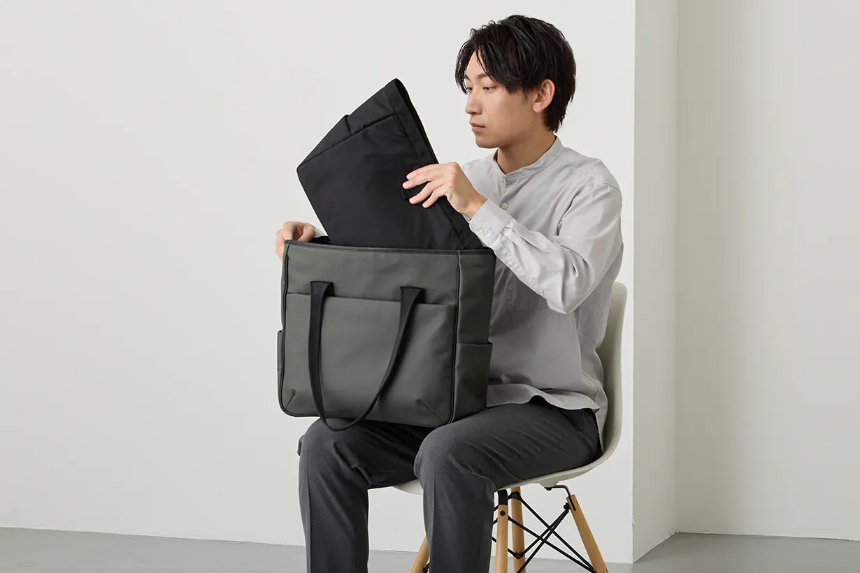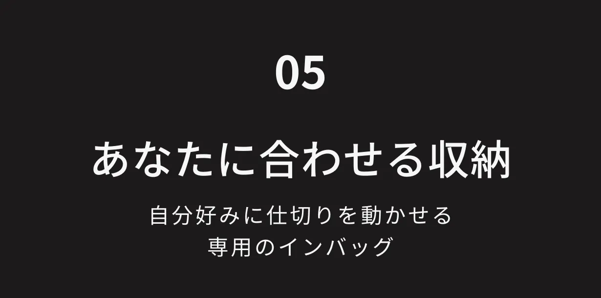 タフビッグトート専用ジャストサイズのバッグインバッグを使えば、あなたに合わせた仕分けが可能。