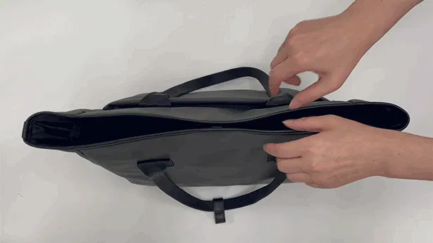 このバッグは底を中心で畳むことが出来るので、保管時もスペースを取らない設計です。