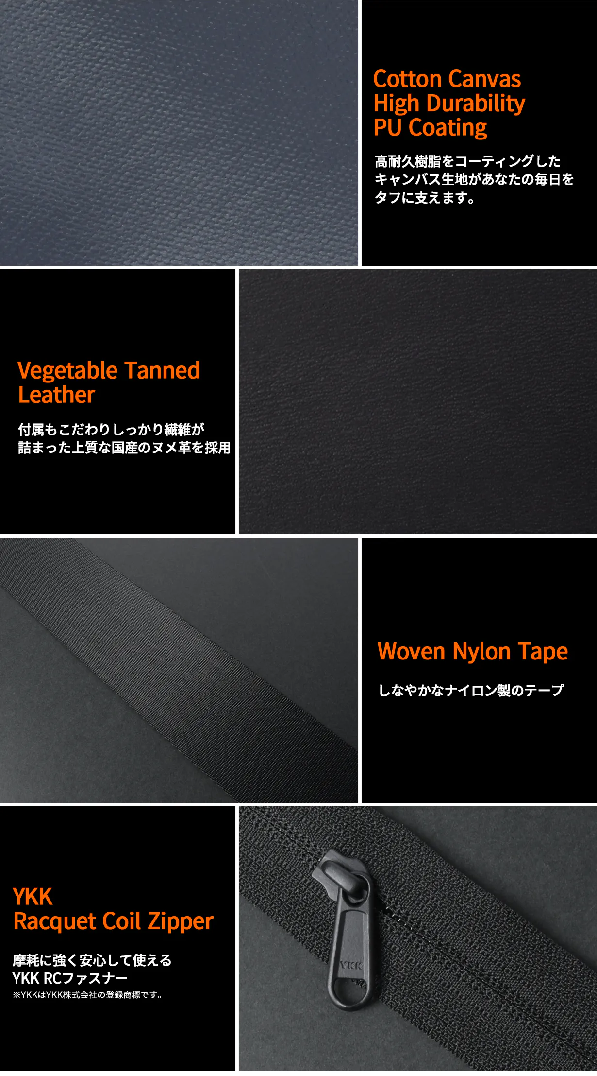 キャンバスのラフさと、樹脂コーティングによるシックさが両立した風合いが大人のカジュアルさを演出し、普段のコーディネートにも良く馴染みます。