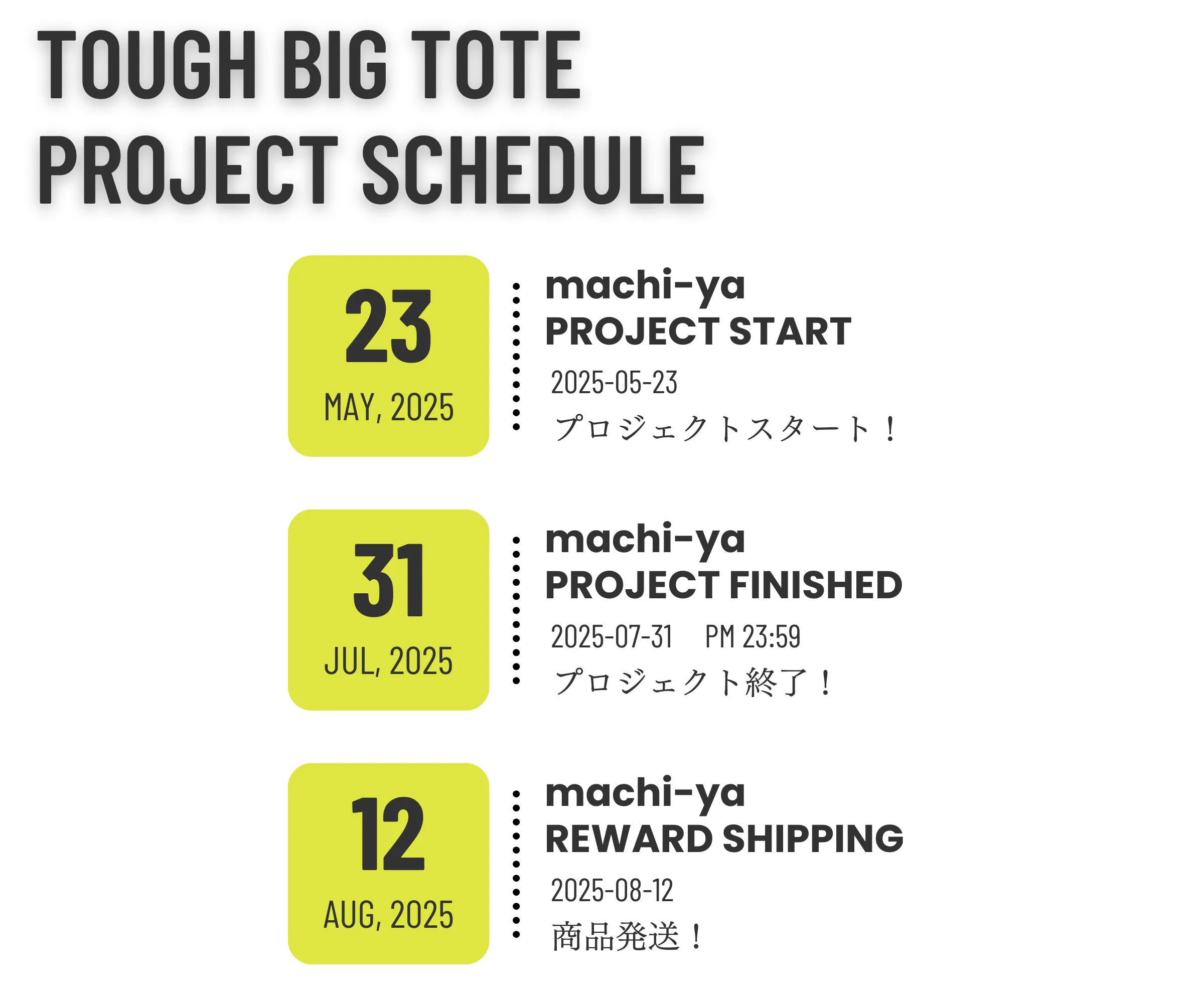 2025/08/01 08:29支援者の皆さま、お世話になっております!TRIDEAL運営の千坂です。昨日をもちまして、クラウドファンディングプロジェクトが無事終了いたしました。あらためて、心より感謝申し上げます。今回のチャレンジを通して、商品や想いに共感し、応援してくださった皆さまの存在が、私たちの大きな励みとなりました。皆さまからのご支援、本当にありがとうございます!本日はリターンの出荷についてご案内をいたします。リターンは、 8/12に大阪にある弊社の倉庫から佐川急便を使って出荷予定です。倉庫には、8/6にお届け先情報を共有する必要がありますので、もし購入時からお届け先に変更がある場合は、8/5までにに変更手続きをお願いいたします。TIMELINE7/31 プロジェクト終了8/5 お届け先変更手続き期限※変更なしの方は何もする必要ありません。8/6 お届け先情報を倉庫に共有※これ以降のお届け先変更は対応致しかねますので、ご注意ください。8/12 リターン発送お客様のご都合により商品が再配達になった場合は、着払いにて再発送いたしますので予めご了承くださいませ。それでは、皆さまにお届けできるその日まで、心を込めて取り組んでまいります。今後とも、どうぞよろしくお願いいたします。TRIDEAL 千坂 もっと見る