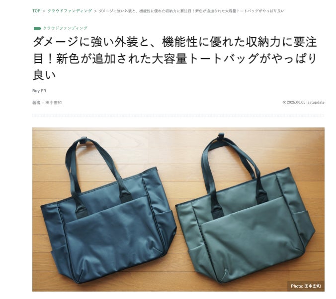 machi-ya、CAMPFIREユーザーの皆さま、こんばんは!先日からTOUGH BIG TOTEのプロジェクトを開始したTRIDEAL運営の千坂と申します。TOUGH BIG TOTEは、2024年にブラックのみを先行して、Makuakeやmachi-yaで先行販売を実施し、沢山の方から購入頂いたプロダクトです。この時の購入者からのアンケートでは、購入者のうち92%以上の方から、もう一度購入したいと回答をいただきました。今回はそんな昨年人気だったプロダクトに、新色としてネイビーとカーキを追加し、machi-yaでのクラウドファンディングにチャレンジ中です。早速ですが、TOUGH BIG TOTEがメディアに掲載されましたので、ご紹介します!掲載元:LIFE HACKERダメージに強い外装と、機能性に優れた収納力に要注目!新色が追加された大容量トートバッグがやっぱり良い記事URL:https://www.lifehacker.jp/article/machi-ya-toughbigtote-review-850581/高耐久素材の詳細など丁寧にご紹介していただきましたので、ぜひ記事もチェックしてみてください。よろしくお願いいたします!TRIDEAL 千坂