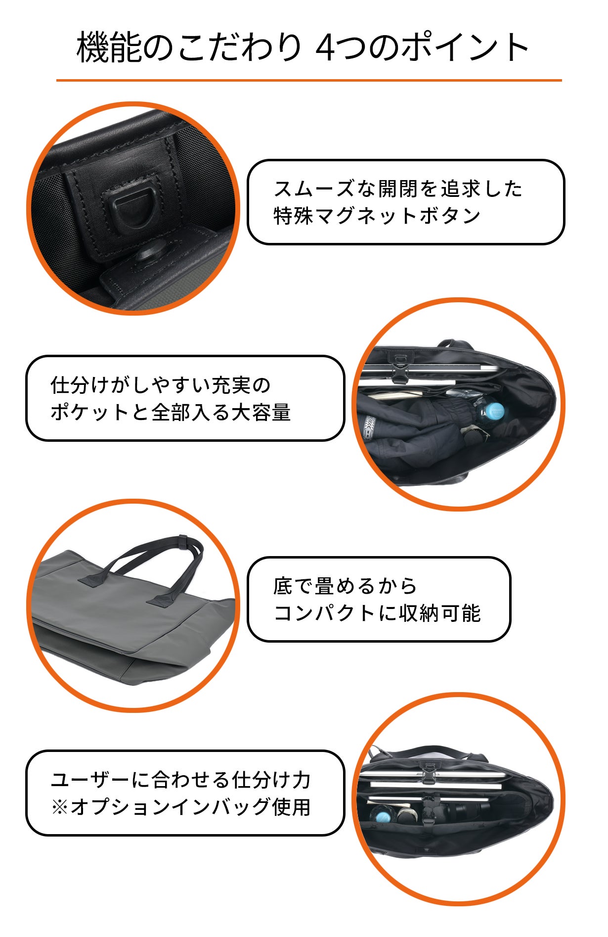 ページ上部でご紹介した通りタフビッグトート専用の機能的なバッグインバッグをオプションとして用意しております。