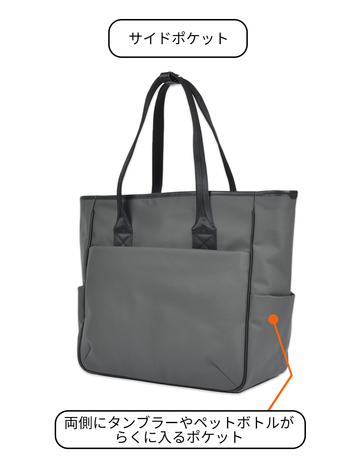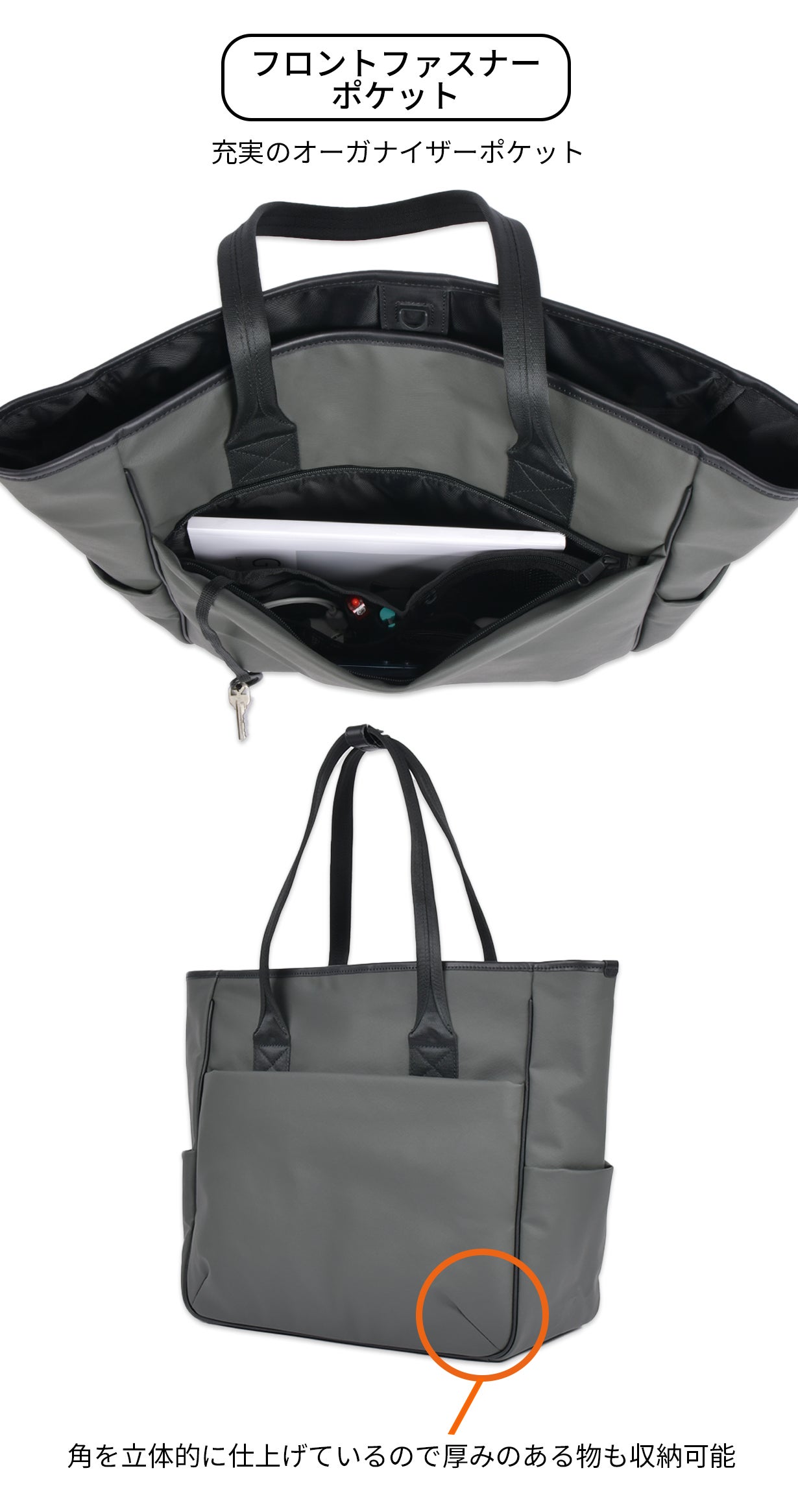 キャンバストートならではのざっくりと使えるメイン収納の大容量はもちろん、充実の小分けポケットでビジネスシーンにもしっかり対応します。