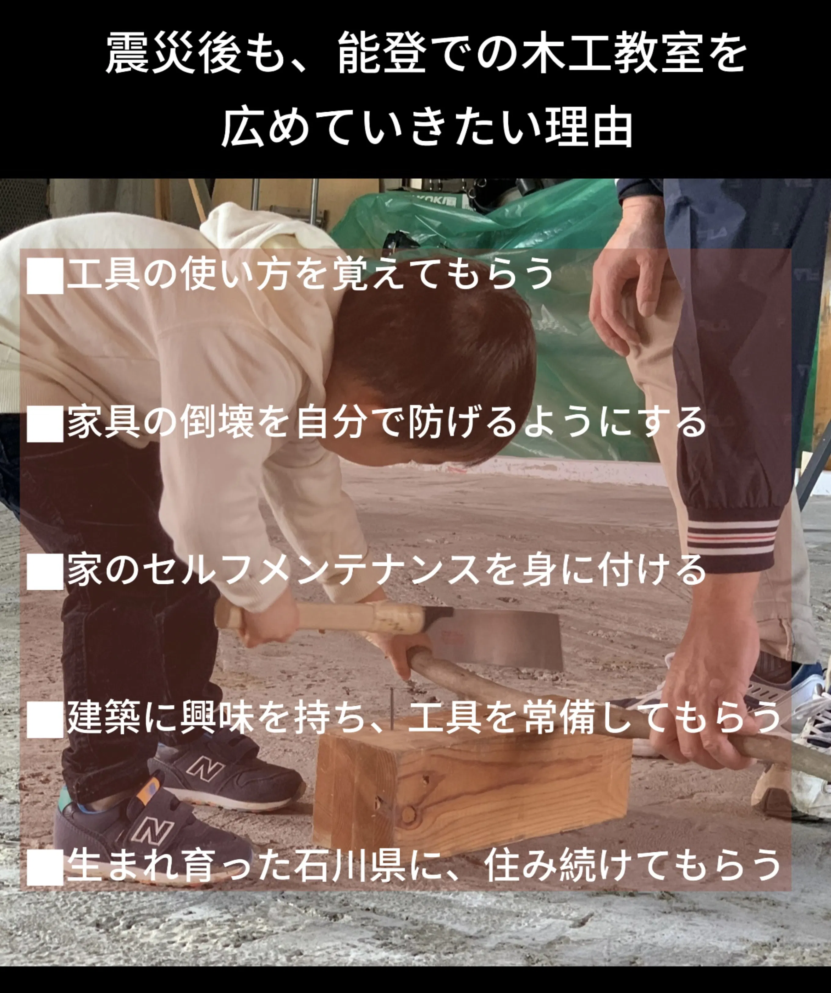 このプロジェクトの最終目的は、石川県内の子供達の建築スキルの向上に貢献する事です。