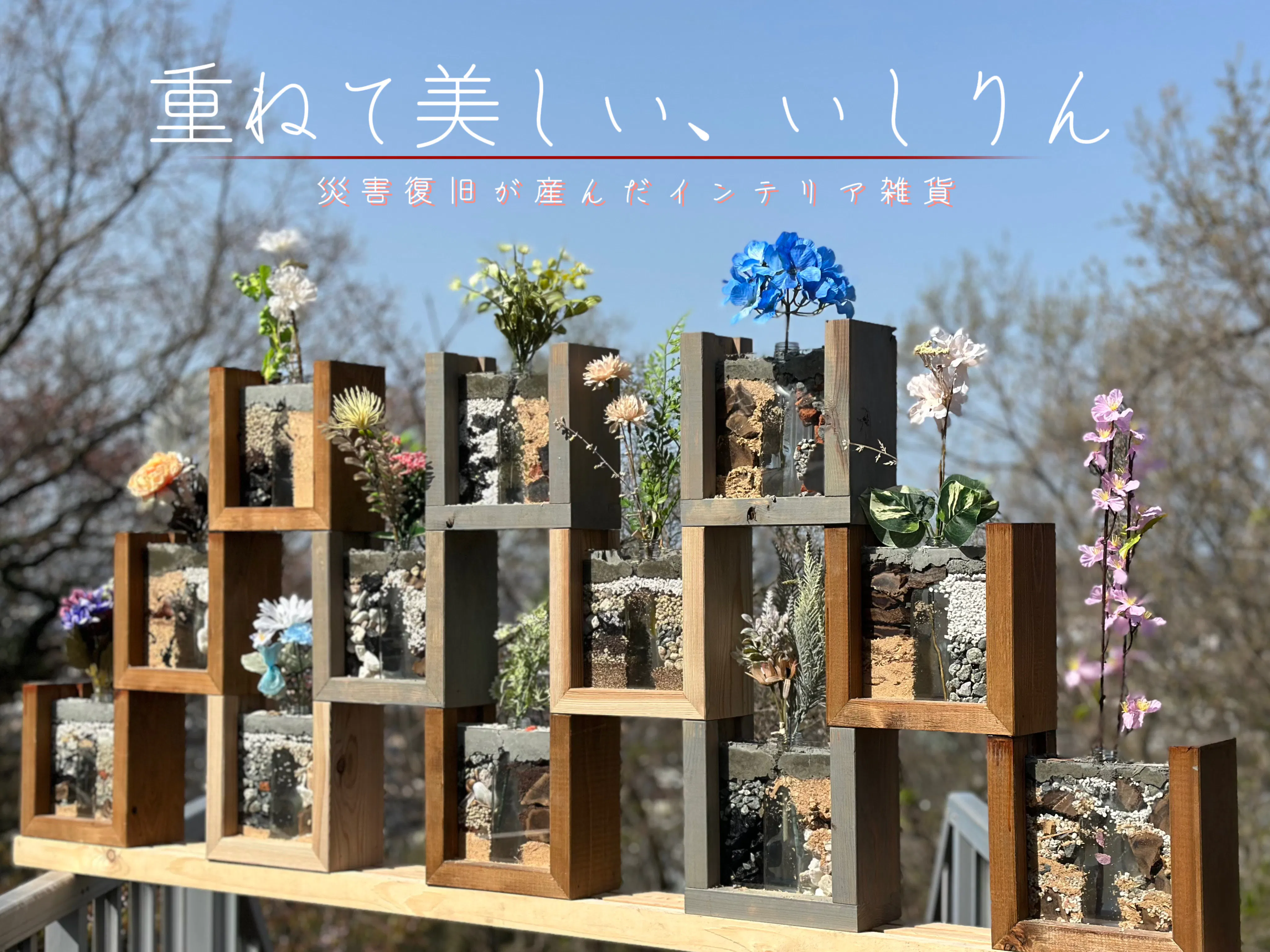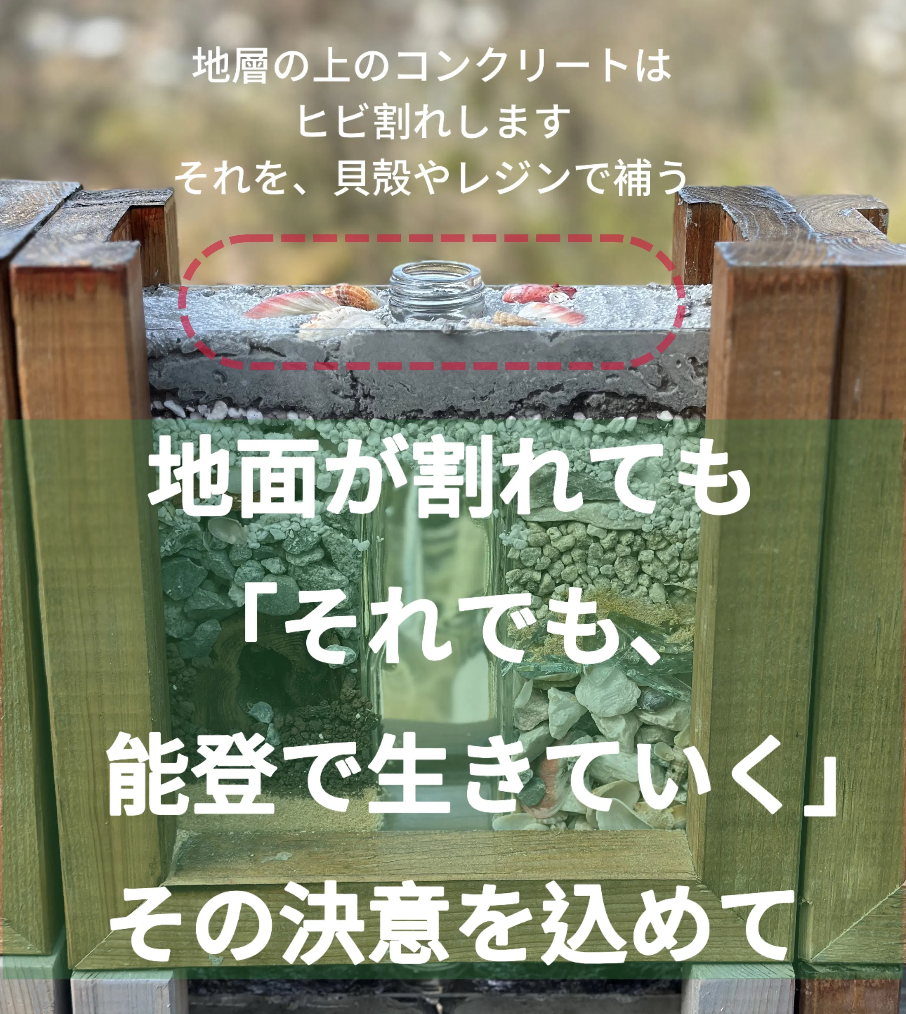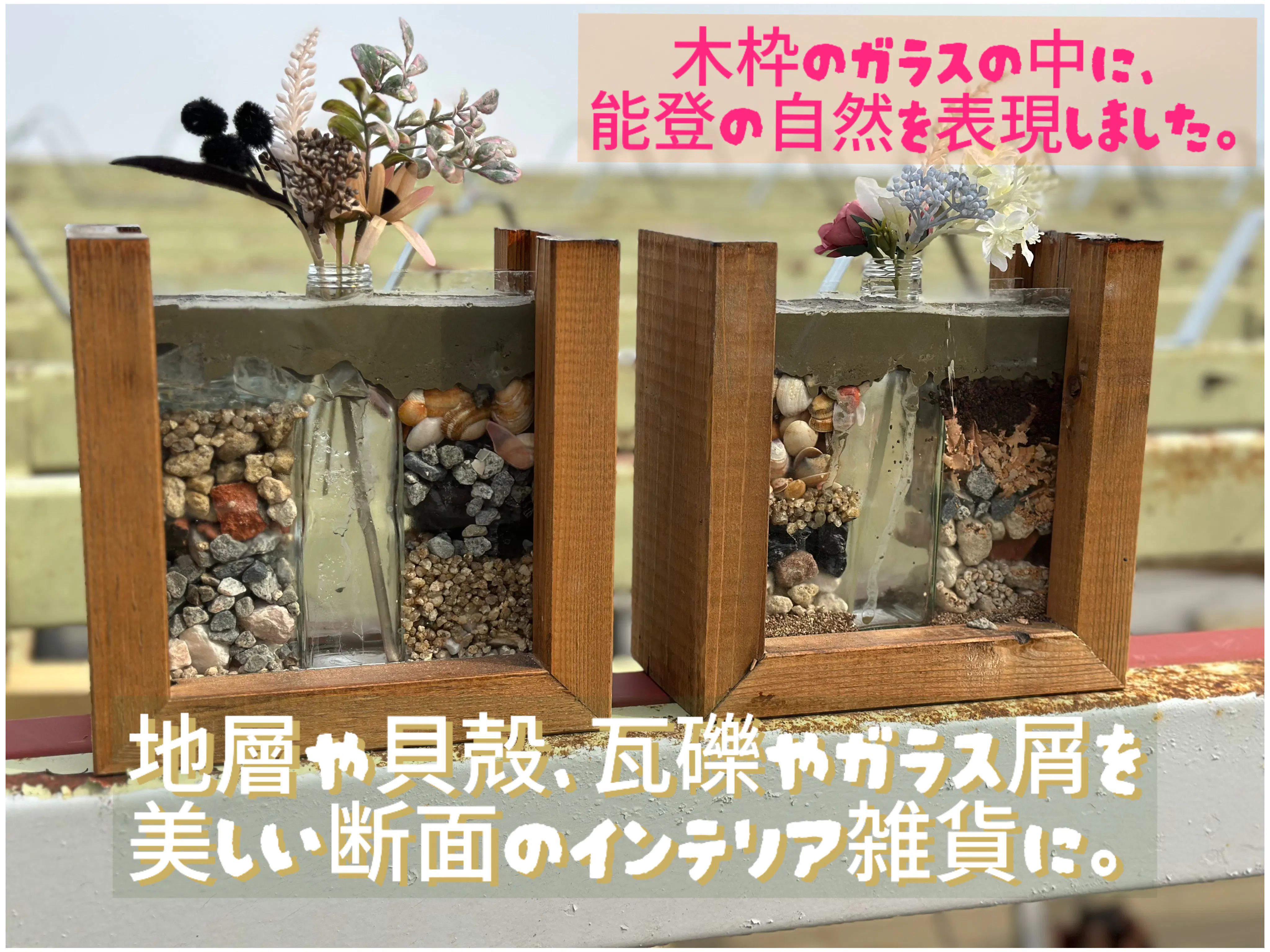 廃材で枠をつくり、ガレキを能登の自然と一緒に閉じ込めた一輪挿し。