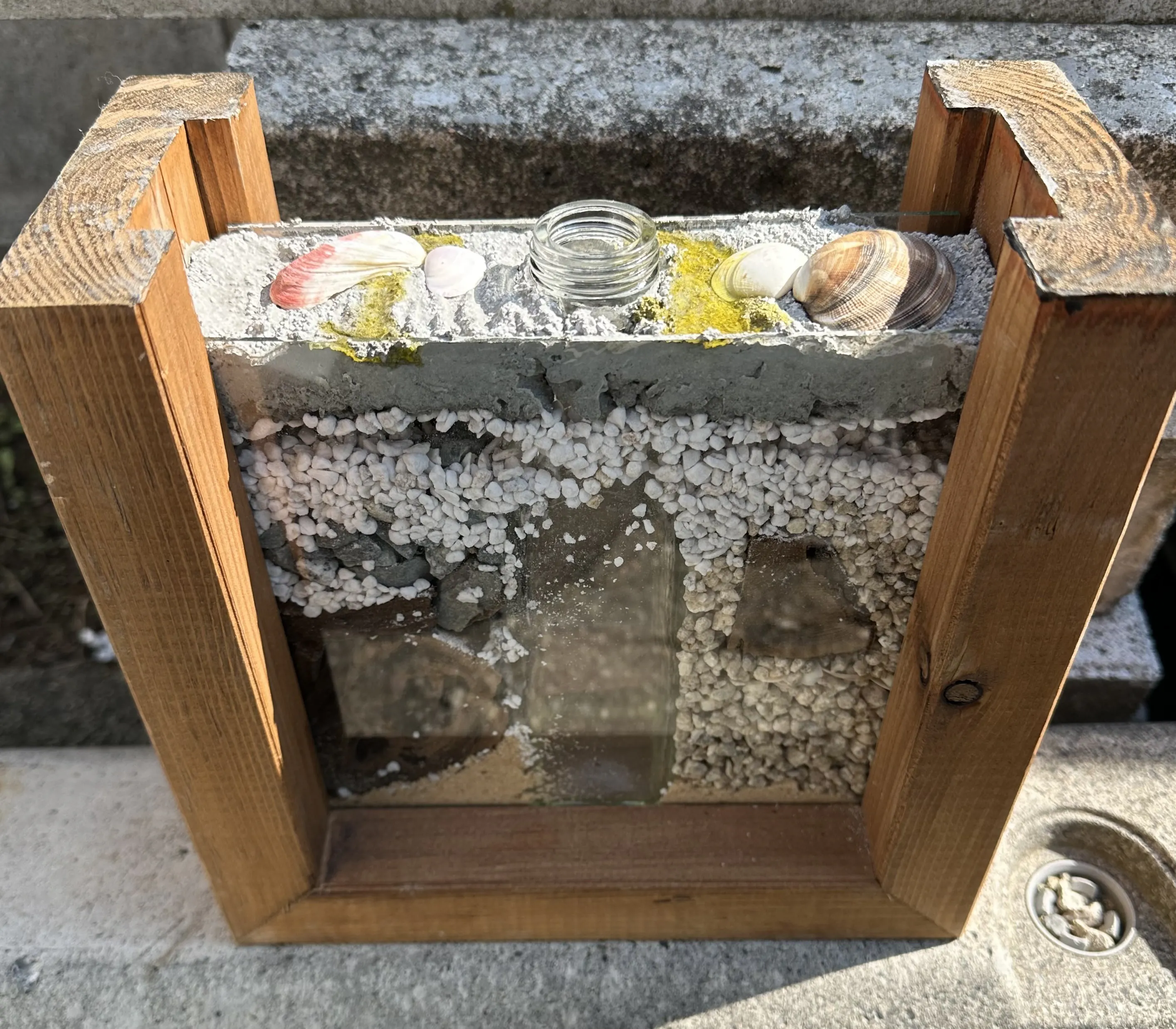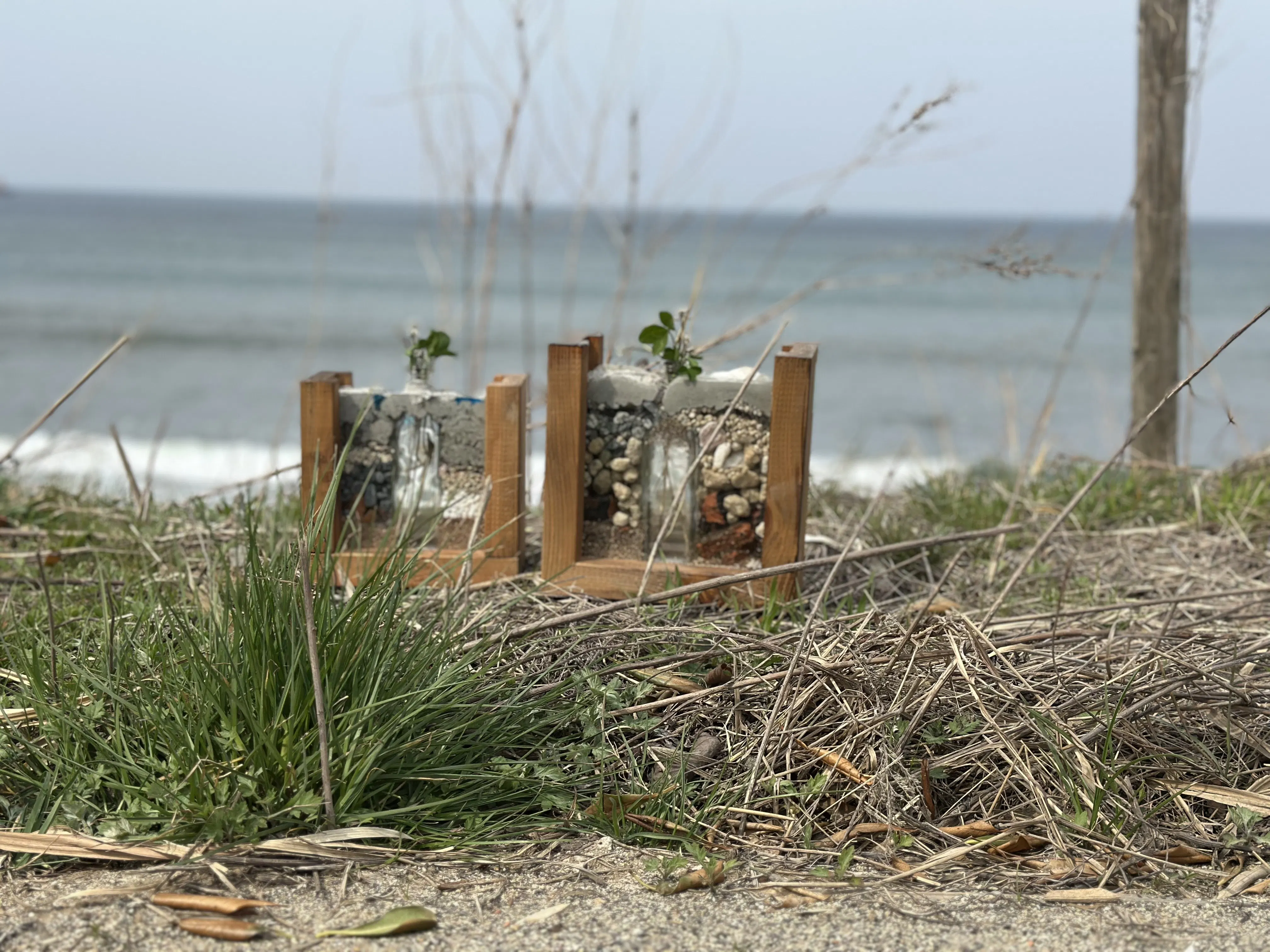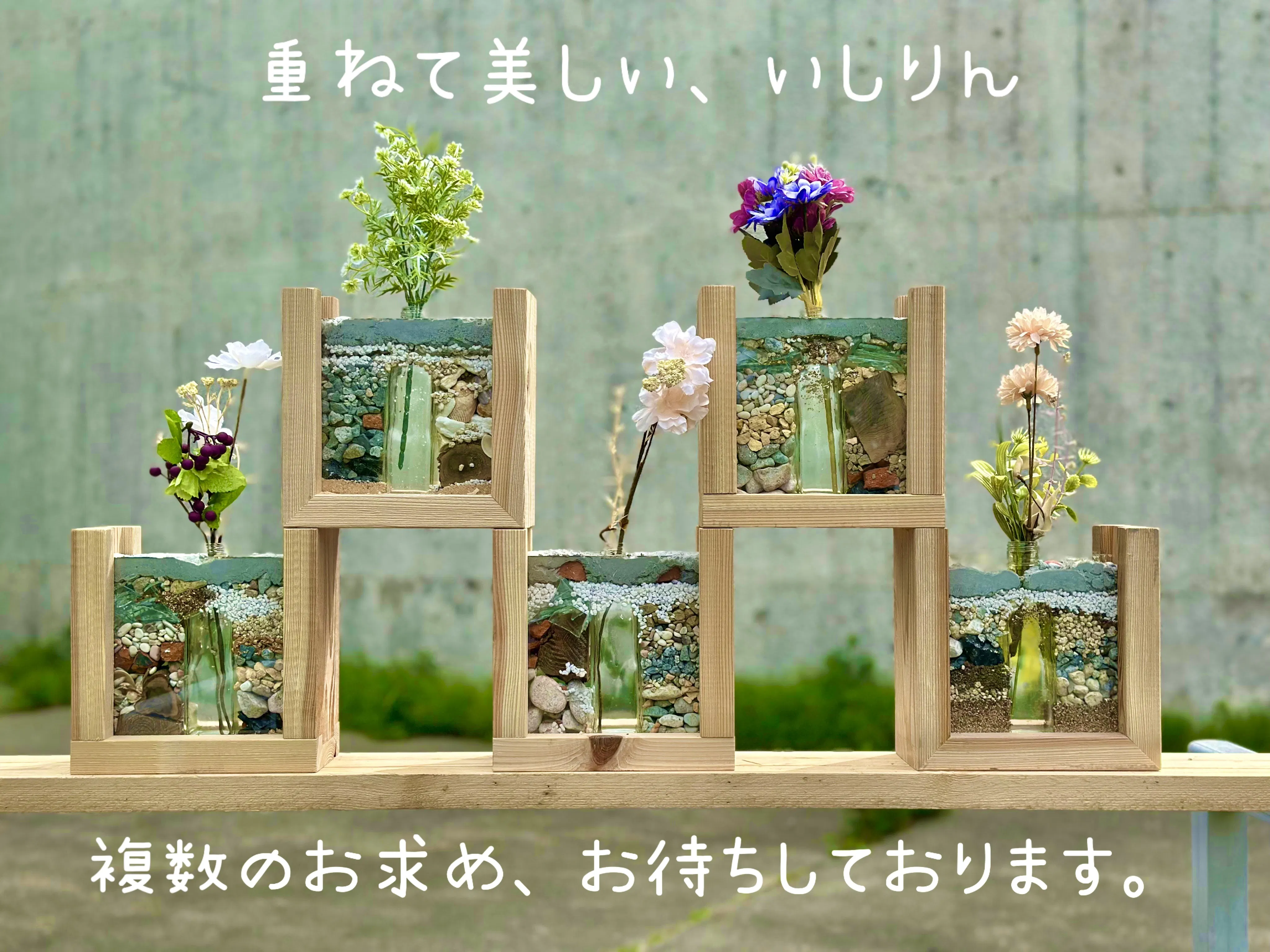 廃材で枠をつくり、ガレキを能登の自然と一緒に閉じ込めた一輪挿し。